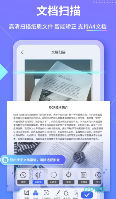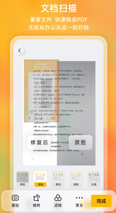 弱光环境下仍保持高信噪比成像,支持连续多页拍摄并自动合成单个PDF文件;内置多语种OCR模块,涵盖中、英、日、韩、法、西等十余种语言,翻译结果可直接嵌入扫描页;证件扫描专属模式提供自定义水印叠加功能,防止信息被恶意复用;智能背景分离技术精准剔除桌面纹理、纸张折痕及杂色干扰,输出画面干净规整;界面层级精简,核心功能三步可达,兼容学习资料归档与日常办公协作。