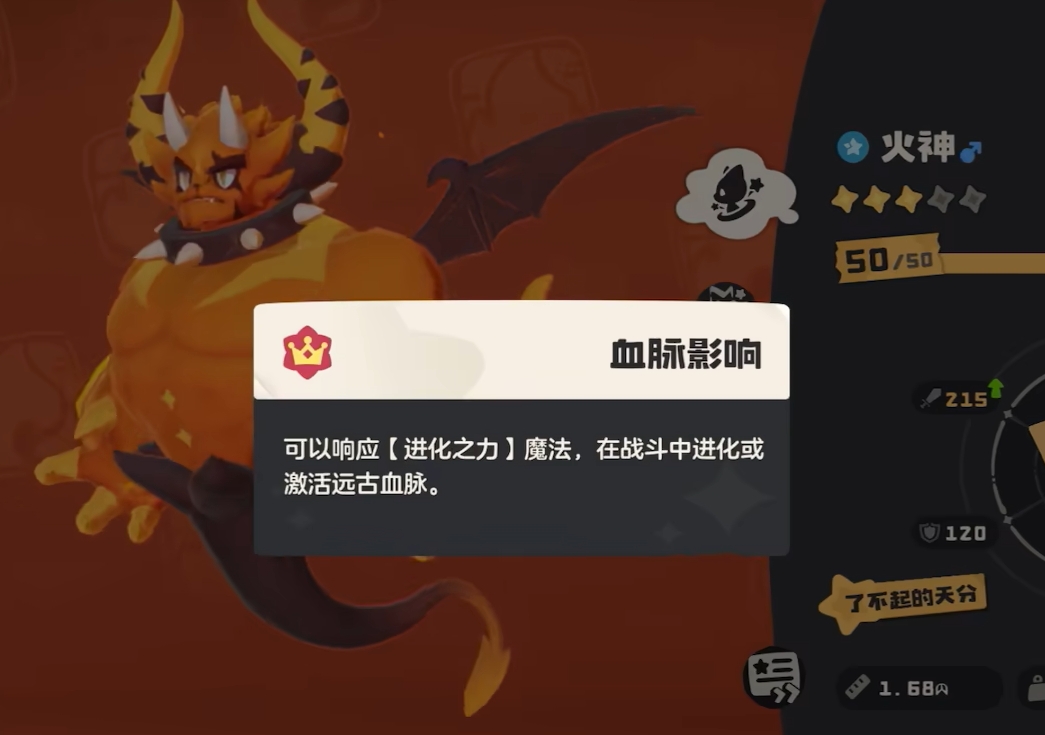 当火神完成首领化进阶为烈火战神后,其专属特性“助燃”获得质变——该特性叠加层数不会因换宠或下场而清空,从而支撑起更激进的火系连招体系。此时推荐技能组调整为:防御、热身、吹火、暗突袭。“防御”延续减伤职能;“热身”替代原“力量增效”,使其下一次技能伤害翻倍,与高层数“助燃”协同触发指数级爆发;“吹火”为火系技能,每次使用固定提升20点基础威力,是烈火战神核心输出循环的起点与增幅引擎;“暗突袭”具备高基础伤害与吸血效果,显著增强持续作战能力,降低被反杀风险。
