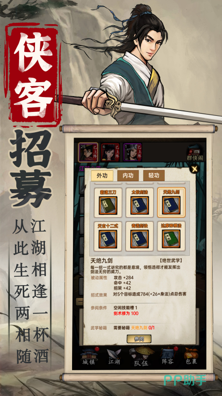 强调角色塑造的完全自主性:从初始外貌定制,到属性分配、心法选择、奇遇倾向,全程无固定职业限制。动态奇遇系统随时间、地点、行为实时生成事件链,提升重玩价值。武器库覆盖刀枪剑戟等十余类,每类含多阶成长路径;豪侠招募机制允许玩家组建跨门派、多流派协同作战队伍。