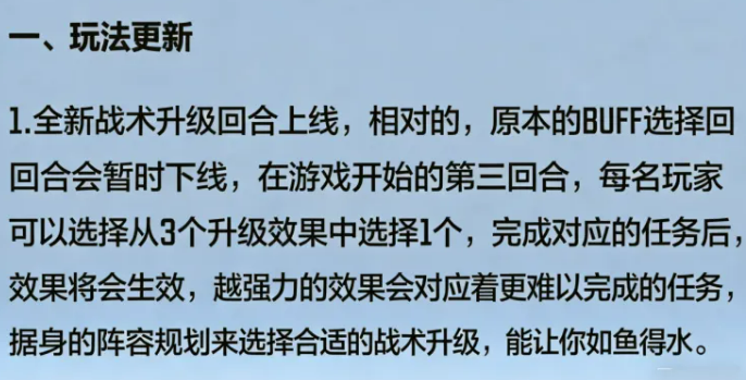 战术升级是本赛季引入的独立阶段,固定于第三回合触发,取代了旧版直接发放增益的简单模式。系统将从全部升级池中随机筛选三项效果供玩家三选一,每一项均绑定唯一激活条件——仅当该条件在后续对局中被满足时,对应效果才会正式生效。值得注意的是,效果强度与激活难度呈正相关,但高数值≠高收益。能否真正兑现效果,取决于玩家当前所构建的卡组流派、场上局势及操作习惯,而非单纯比对纸面数值。