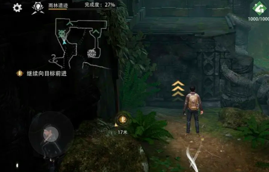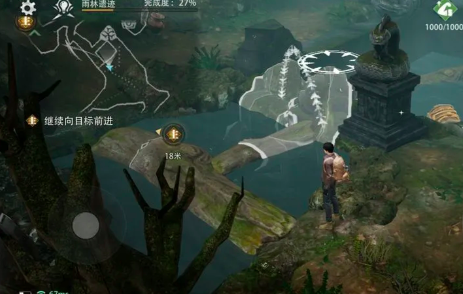 任务起点位于雨林遗迹章节,传送至林地后,玩家需穿越蜿蜒小河,跨越两处天然山石,继而在隐蔽水面区域发现首个宝箱。该区域布设多座石桥与可交互浮木,地形复杂但线索清晰。推荐优先选用吴邪角色——其搭载的罗盘装置能显著缩短机关识别与方位校准时间,提升整体解谜效率。