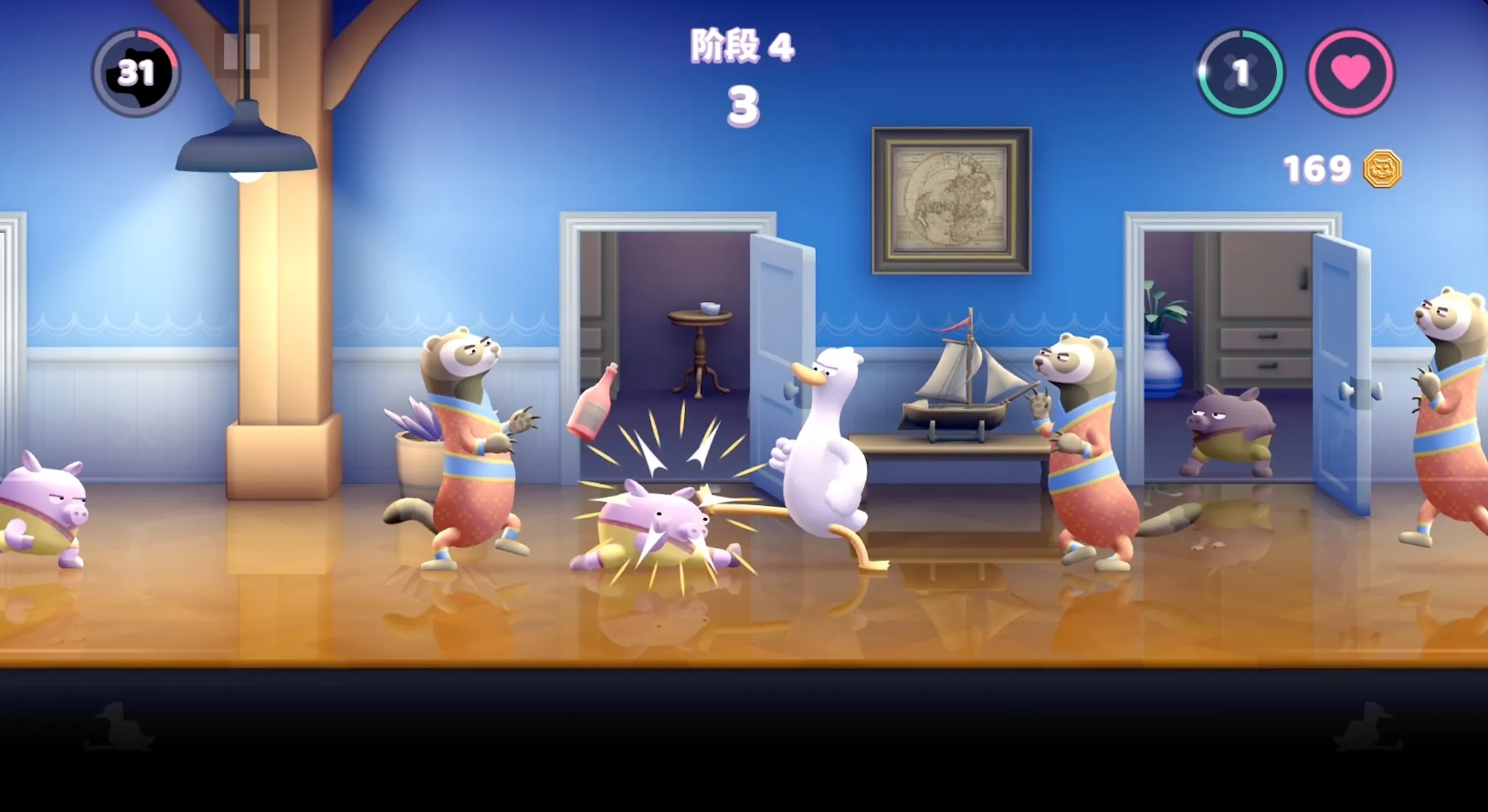以极简美术风格构建高强度快节奏闯关体验。玩家操控拟人化鸭子拳手,在有限屏幕空间内应对波次递增的敌人围攻。系统摒弃复杂指令输入,采用三键式操作(轻击/重击/闪避),所有招式均基于真实拳击力学设计,包括直拳距离判定、勾拳侧身判定及体力槽衰减机制。关卡内置动态难度调节,敌方AI根据玩家连击数与生存时长实时调整攻击频率与组合逻辑。