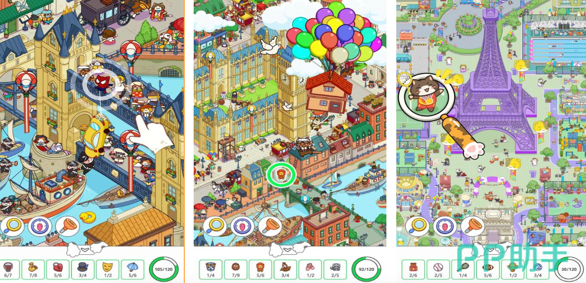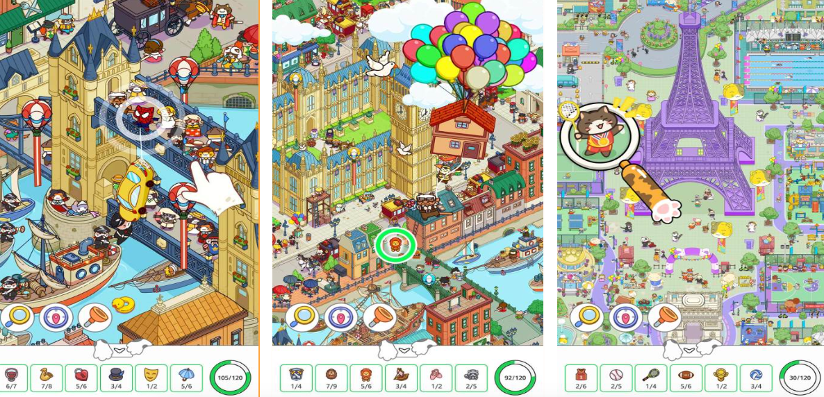 本作以全球地理文化为背景,构建出涵盖巴黎街巷、京都古寺、伊斯坦布尔集市等数十处真实风貌场景。玩家需在高饱和度、多图层叠加的画面中识别目标物品——从埃菲尔铁塔模型的微小反光,到浮世绘屏风上的隐藏纹样。每完成一地搜寻,即可解锁对应国家的器物图鉴,累计收集达180+件跨文化藏品。游戏无时间限制,强调沉浸式观察体验与渐进式难度设计。