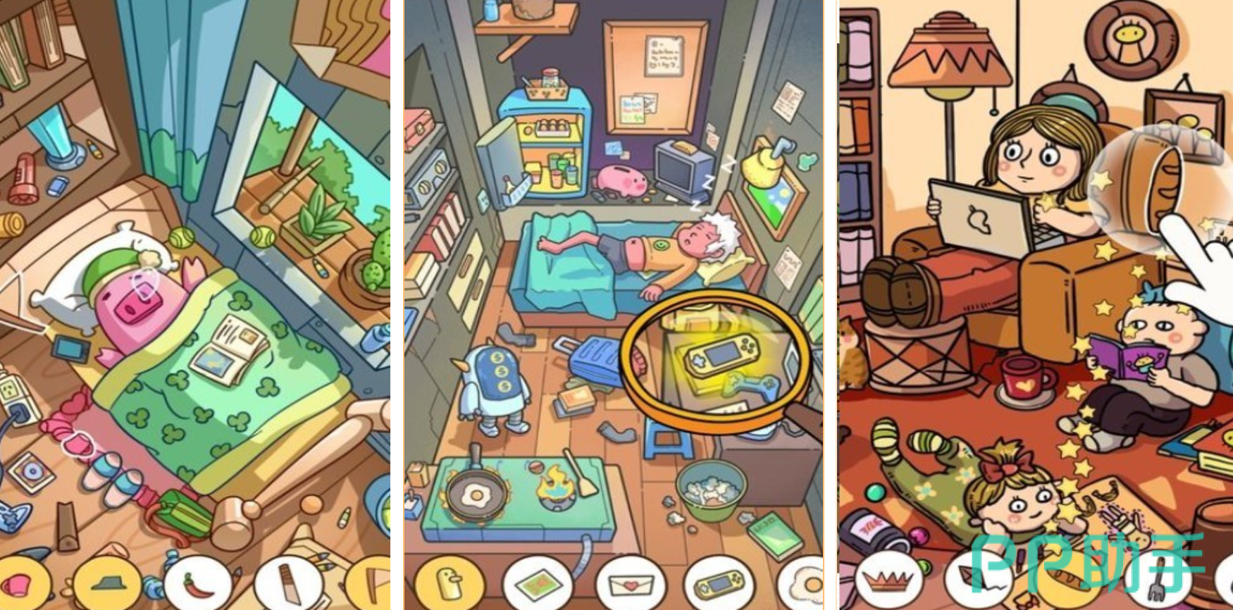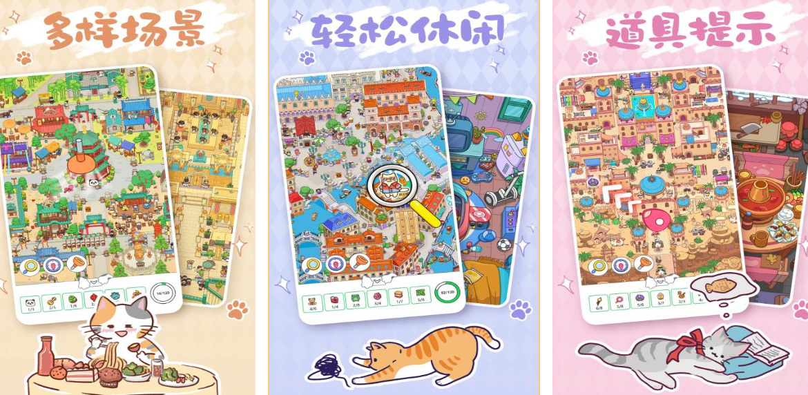 游戏以养猫生活为切入点,打造温馨治愈的居家寻物体验。玩家需在包含32个可探索房间的立体猫宅中定位躲藏的猫咪,并同步整理散落物品——如从毛线团缠绕的沙发缝隙中找出猫铃铛,或在堆叠的猫砂袋后发现失踪的逗猫棒。收纳系统采用物理碰撞判定,拖拽物品时触发真实重力反馈;全关卡共含96种猫咪行为模式与137件家居道具,支持自由布置猫爬架结构。