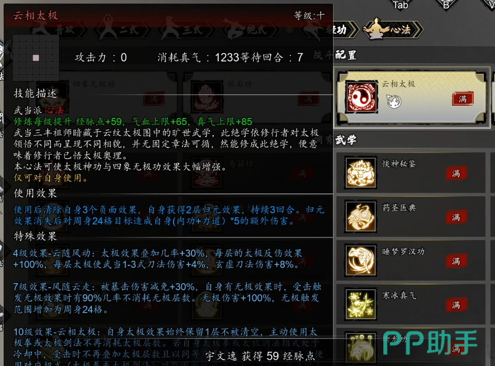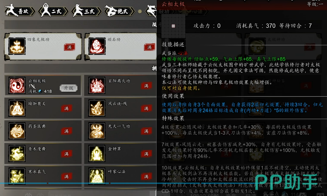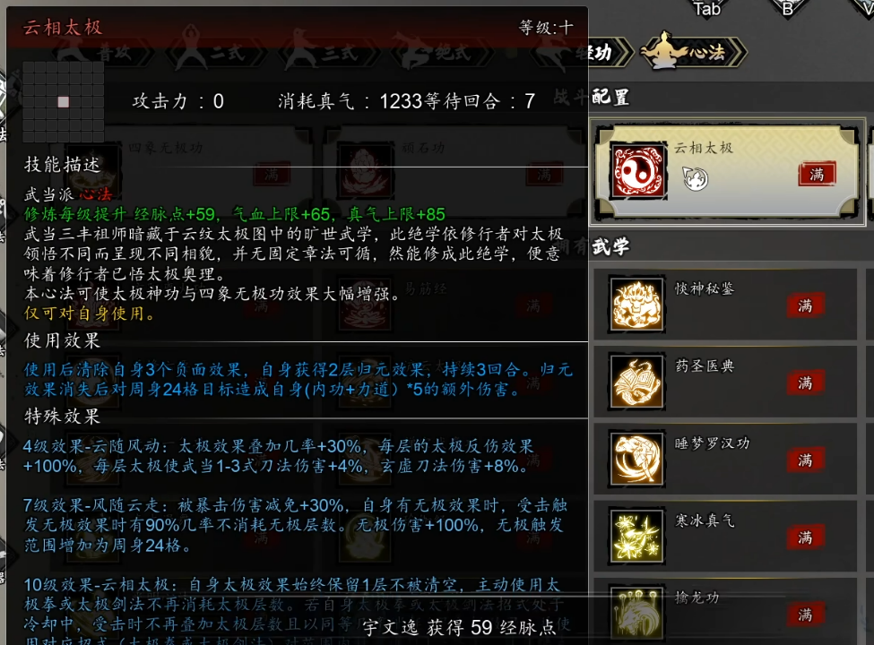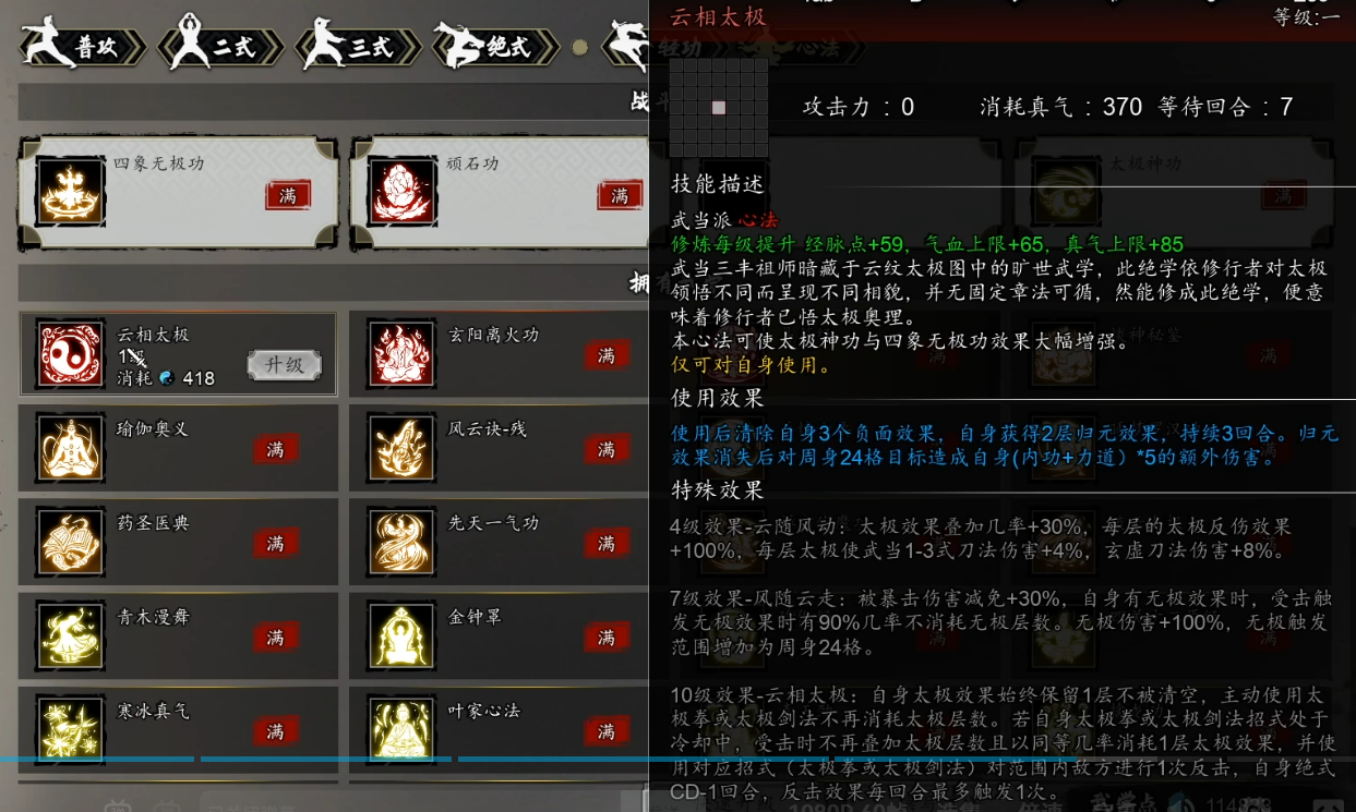 该心法属于被动触发型,必须与指定主修功法绑定方可激活全部效果。仅当角色主修《太极神功》或《四象无极功》时,云相太极才会生效。升至四级后,战斗初始即自动获得一层“太极状态”,每层可提升武当刀法与玄虚刀法的基础伤害;同时,所有太极系反制伤害提升100%。此阶段已初步构建起攻防一体的节奏基础。