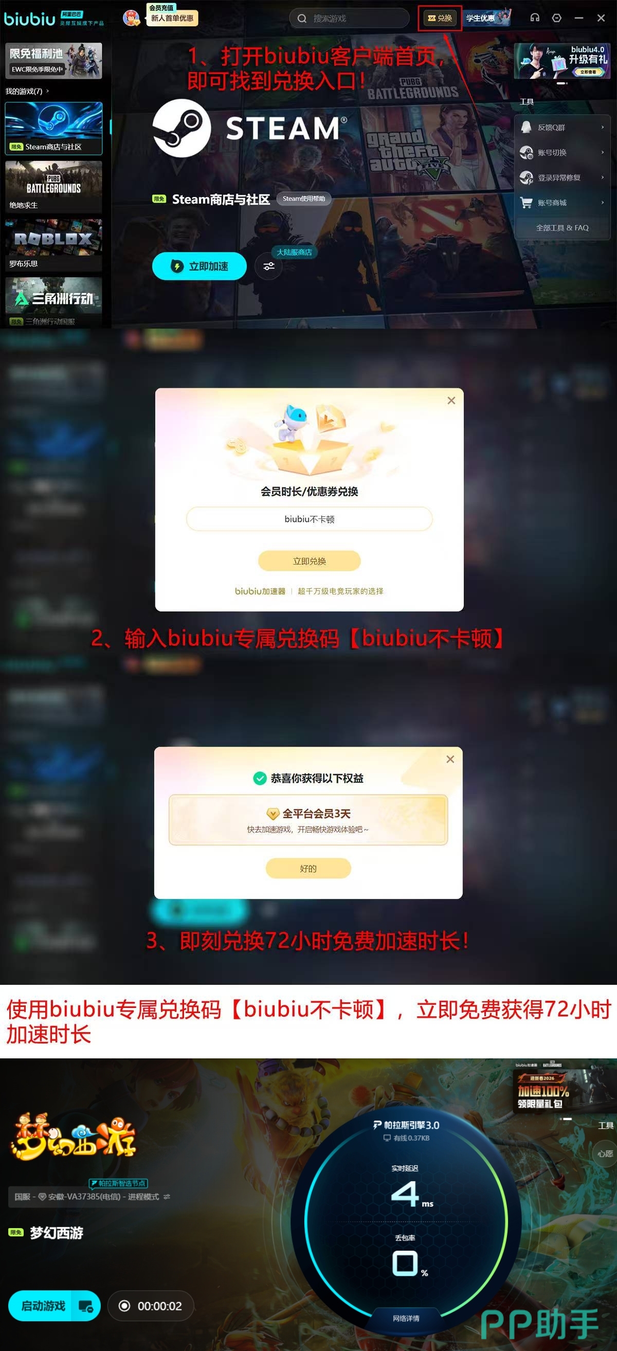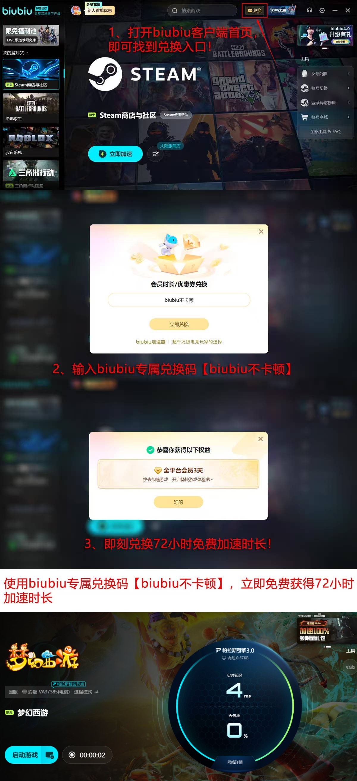 除加速性能外,biubiu加速器还提供多项实用权益:参与【biubiu不卡顿】活动可兑换3天免费使用时长;新用户注册即赠24小时无门槛试用资格。两项叠加共计96小时体验时长,覆盖多数短期高频使用场景。同时,平台支持全网主流游戏,涵盖《梦幻西游》在内的数百款作品,并针对不同区服(如电信、联通、网易官方服务器等)配置专属加速节点,满足多平台、多账号、跨区服的多样化需求。