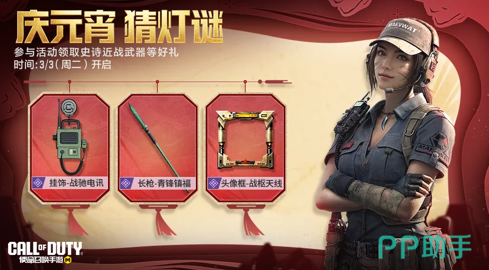 自3月2日起启动周末专项福利。其中,3月6日至4月30日期间开放“传说武器自选池”,共含9款传说级装备。玩家通过参与任意匹配或排位对局积累能量点,单局基础得1点,每周上限为4点,累计满16点即可在活动页面任选其一。此外,每周首次分享活动链接可获“传说武器体验自选宝箱”;3月3日上线元宵主题灯谜挑战,完成答题任务即赠史诗级长枪“青锋镇福”及其他稀有道具。