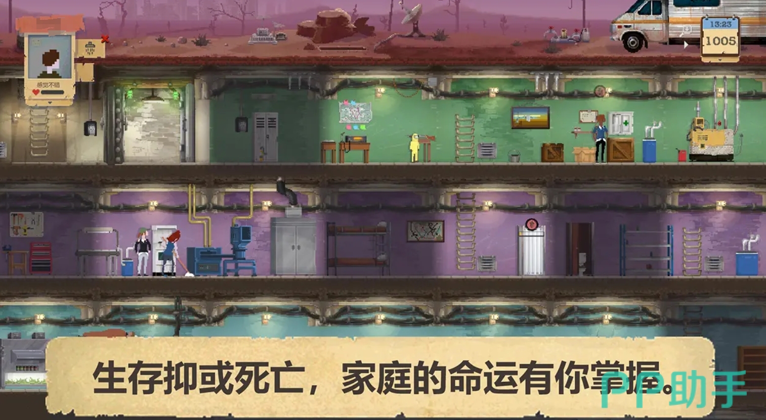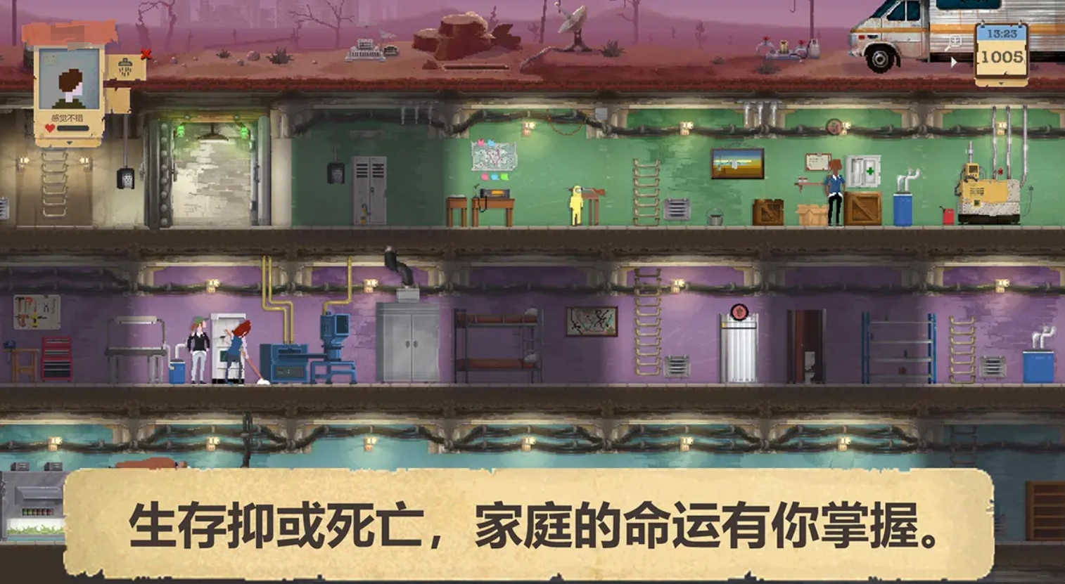 本作聚焦于避难所宏观运营体系:玩家作为决策者,需统筹安置流民、分配生活物资、调度劳动力。幸存者可被指派至各类末日工厂从事生产活动,获取基础收益;亦可选拔体能或战斗资质突出者组成探索小队,深入荒原废墟及废弃城市搜刮稀缺资源。随资源积累,避难所可逐步升级防御模块,强化对变异生物的抵御能力,并解锁医疗中心、净水系统、训练场等关键功能性区域。