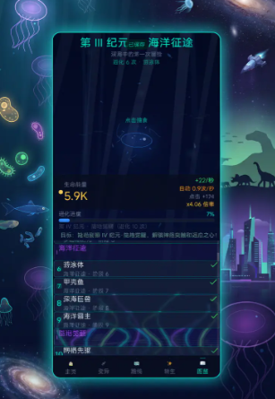 游戏采用阶段式视觉演进系统:初始界面呈现微观化学结构,随着单细胞→多细胞→组织分化→器官成型→运动能力觉醒等关键跃迁,画面风格同步升级,粒子特效、动态形变与生物质感逐级增强。玩家可直观见证鞭毛出现、神经突触连接、骨骼支撑结构生成等标志性演化节点,全程无剧情打断,仅靠形态变化传递科学逻辑。