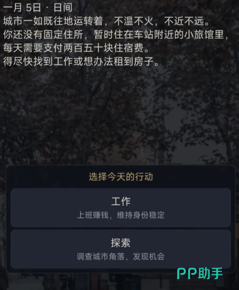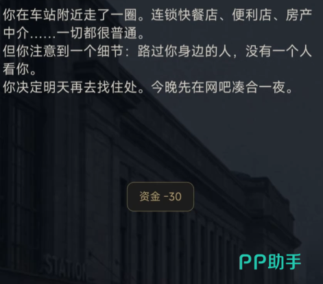 角色衣着整洁但陈旧,经济状况紧迫。下车后可选择在站内短暂停留:此处提示“周围人流密集,却无人对你投以目光”,细微异常埋下伏笔。因暂无落脚之处,首晚暂宿网吧;次日仍未寻得稳定住所,只得入住每日收费250元的小旅馆。