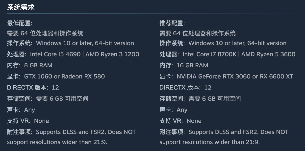 官方公布的最低配置标准,面向1080p分辨率、低画质、30帧稳定运行场景。CPU需达到Intel Core i5-4690或AMD Ryzen 3 1200同级水平;显卡须为NVIDIA GeForce GTX 1060(6GB)或AMD Radeon RX 580(8GB)及以上;系统预留存储空间7GB;不支持VR设备。若您的设备恰好满足该门槛,可完整体验主线剧情,但在多光源、高密度粒子或复杂动态光影场景中,可能出现轻微帧率波动。