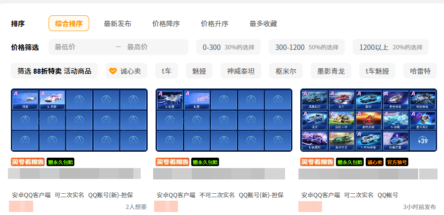 在选号环节,平台支持多维精准筛选:可按指定车型(如雷诺、幻影、极夜等)、特定时装(含节日限定、联动款、SSR品质)、段位等级(如车神、王牌、传说)、甚至是否带强化芯片、改装配件等条件组合检索,大幅缩短匹配时间,高效锁定理想账号。