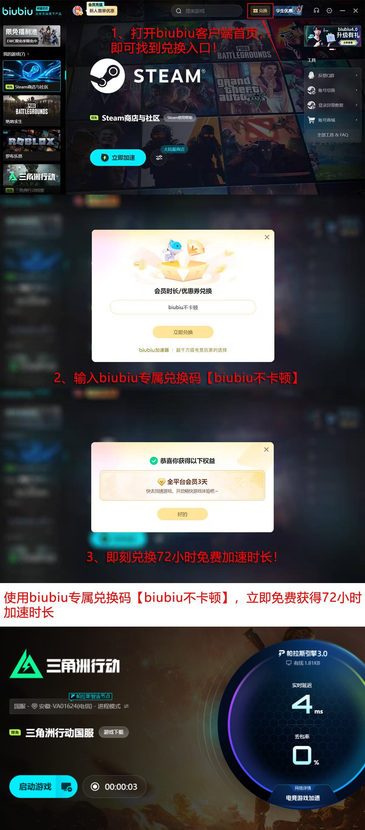 新注册用户默认享有24小时全游戏加速权限,输入激活码“biubiu不卡顿”可额外获得72小时加速时长;叠加首次登录奖励,总计可达96小时免费体验周期,充分覆盖多场景压力测试需求。