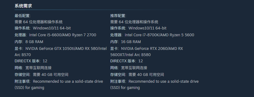 根据官方公开的技术规格,游戏最低显卡要求为NVIDIA GTX 1050 Ti,可在基础画质下实现可玩性;若希望开启中等以上特效并维持稳定帧率,则推荐配备RTX 2060或同级显卡;而要完整呈现UE5引擎支持的全部光影、材质与粒子效果,并长期保持60FPS+高帧率输出,建议使用RTX 4070级别显卡。CPU方面,最低兼容Intel Core i5-6600,推荐配置为i7-8700K;内存方面,8GB为启动底线,16GB为流畅运行基准,考虑到UE5引擎对系统资源调度的较高依赖,32GB内存更利于减少加载卡顿与后台干扰。存储空间需预留至少40GB可用容量,且强烈建议将游戏安装于NVMe协议SSD固态硬盘,以缩短场景切换与模型加载时间。