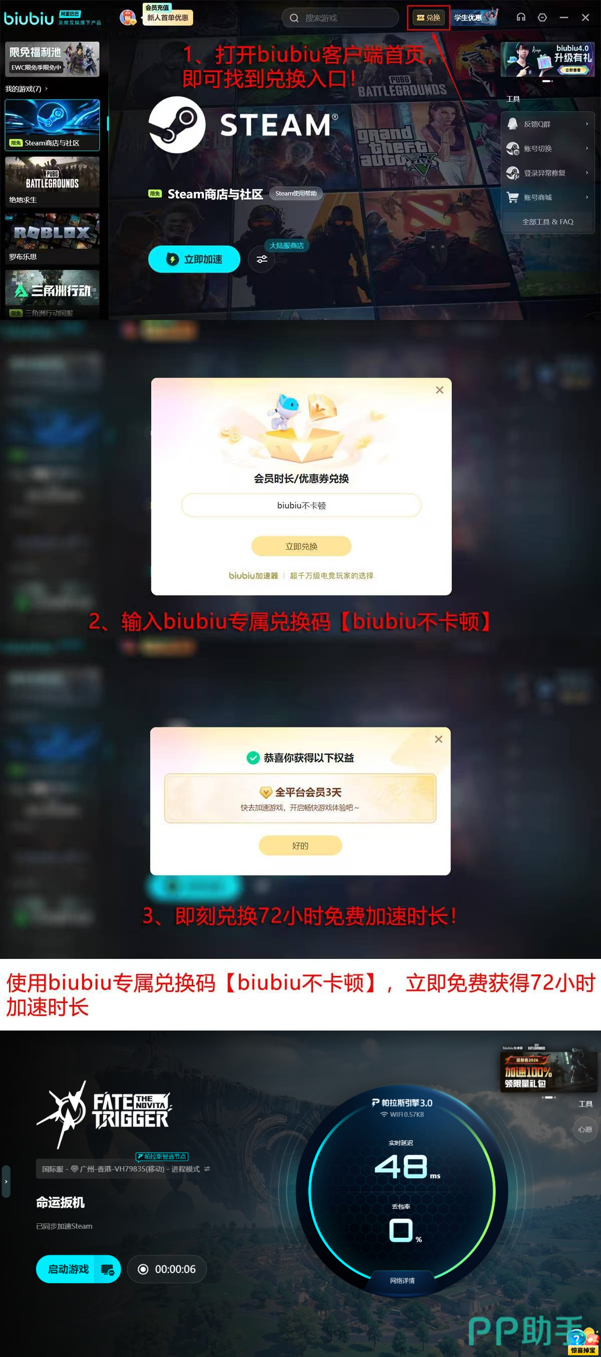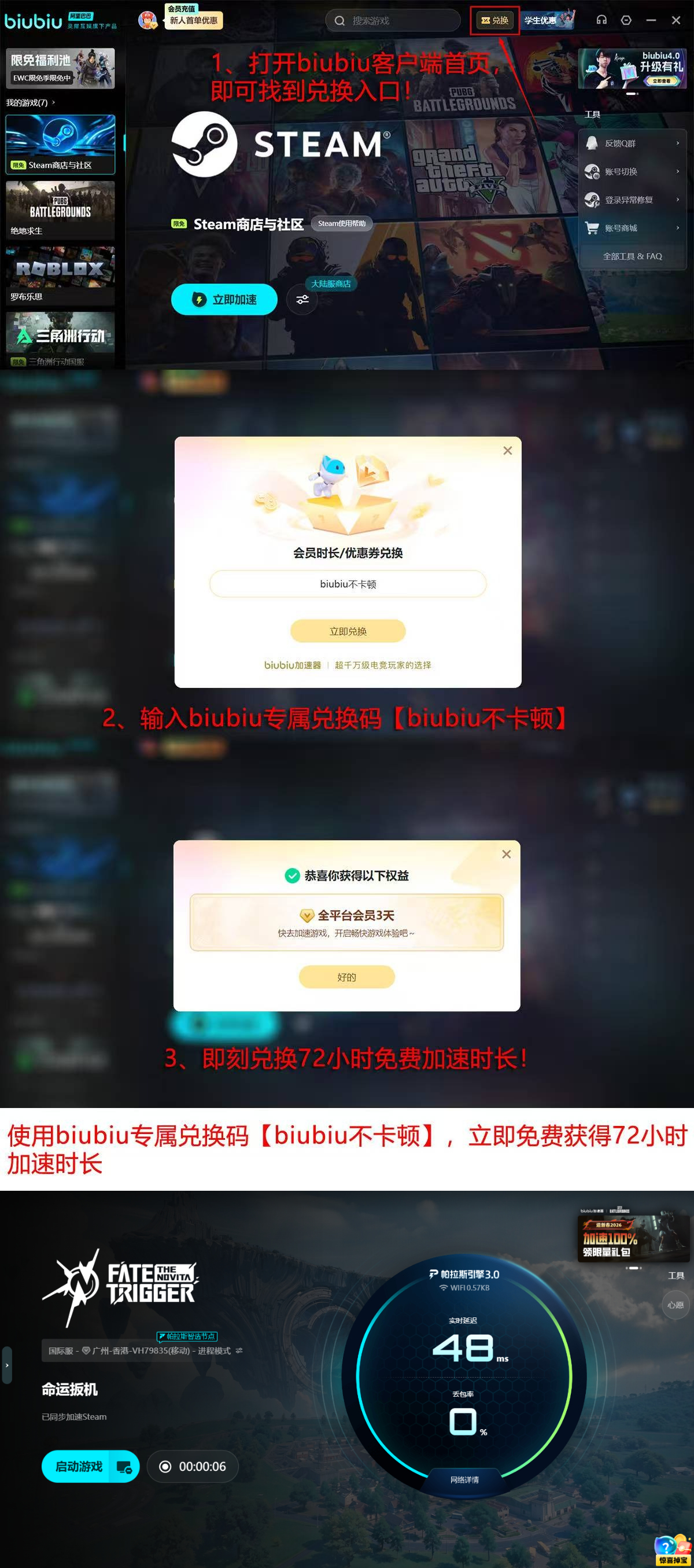 即刻启用,新用户专享加速权益。为降低体验门槛,biubiu加速器面向首次注册用户推出分阶段激活机制:完成账号注册后自动解锁24小时全功能免费使用权;输入专属口令【biubiu不卡顿】,即可追加72小时加速时长,累计可享连续96小时高速下载服务。