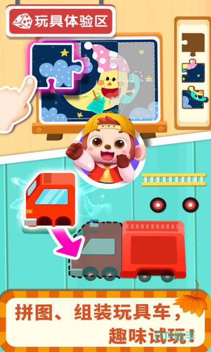 以机械认知启蒙为目标,设计拟真修车流程。孩子可使用扫描仪“透视”车辆引擎结构,识别故障点;通过消除类小游戏获取维修道具,再运用扳手、千斤顶等工具完成更换轮胎、紧固螺丝等操作。所有车辆模型均采用迷你化、卡通化风格,兼顾安全性与探索欲激发。