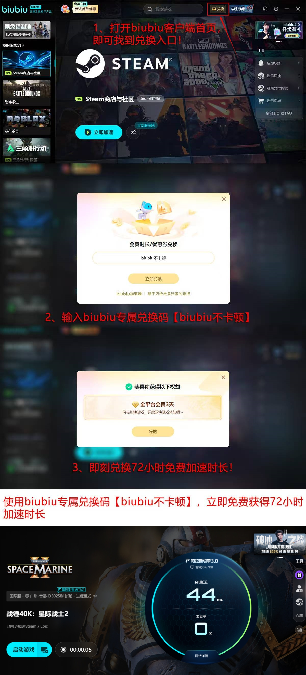 除核心加速能力外,biubiu加速器同步提供覆盖全品类PC及主机游戏的加速资源库,包括《战锤40K:星际战士2》在内的主流外服作品均已预设优化配置。用户亦可参与限时福利活动:输入【biubiu兑换码】即可获赠72小时免费加速权限;新注册账号额外赠送24小时体验时长,累计达96小时无门槛使用权益。此类长周期试用策略,在同类工具中具备明显差异化优势。