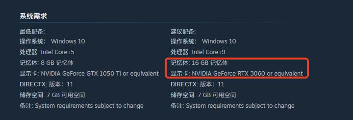 根据开发团队公布的系统需求,游戏最低运行配置为:Intel Core i5系列处理器(如i5-7400及以上)、8GB DDR4内存、NVIDIA GeForce GTX 1050 Ti或同性能级别显卡(如AMD RX 570),操作系统需Windows 10 64位,且预留至少7GB可用存储空间。推荐配置则提升至Intel Core i9处理器(如i9-9900K或更新型号)、16GB内存、NVIDIA GeForce RTX 3060或同级显卡(如AMD Radeon RX 6700 XT)。该显卡亦为当前Steam平台用户装机占比最高的中高端型号之一。