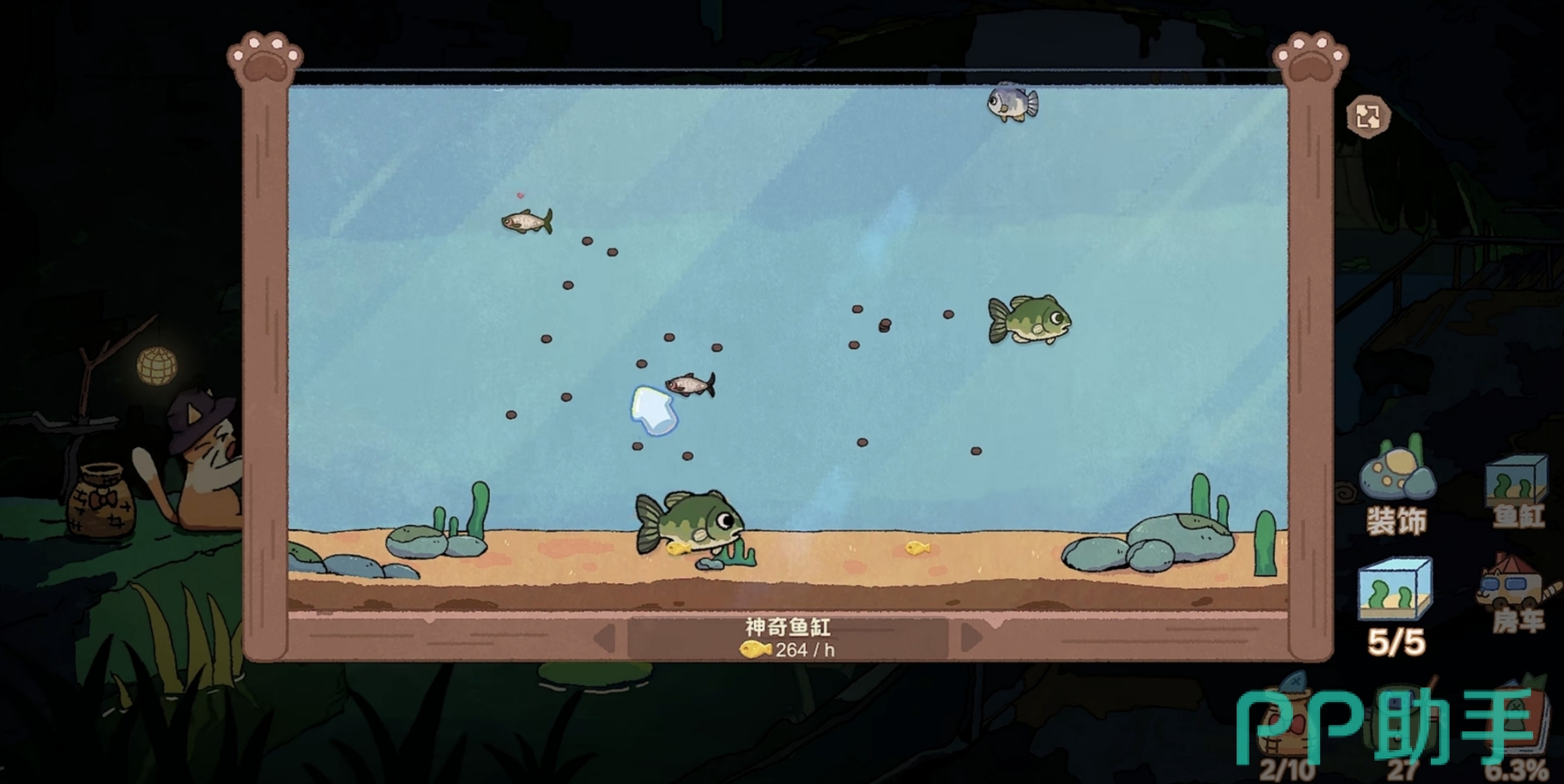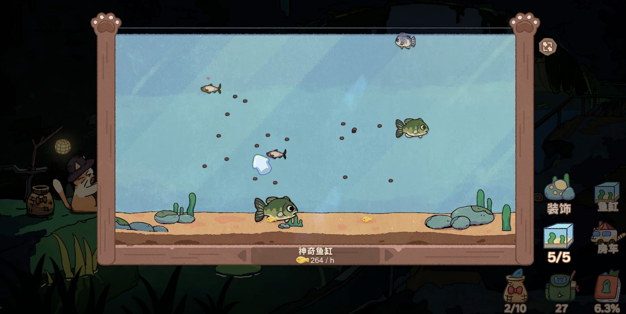 除交易变现外,鱼类还具备装饰与养成双重价值。玩家可将已捕获鱼种放入专属鱼缸,通过持续蓄养获取被动金币收益。商城内开放多类主题装饰物,包括水草、珊瑚、浮木、灯光组件等,支持自由摆放与组合搭配,打造独一无二的视觉空间。所有布局操作均无预设限制,充分满足个性化表达需求。