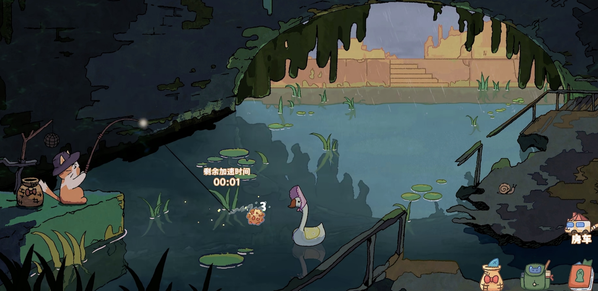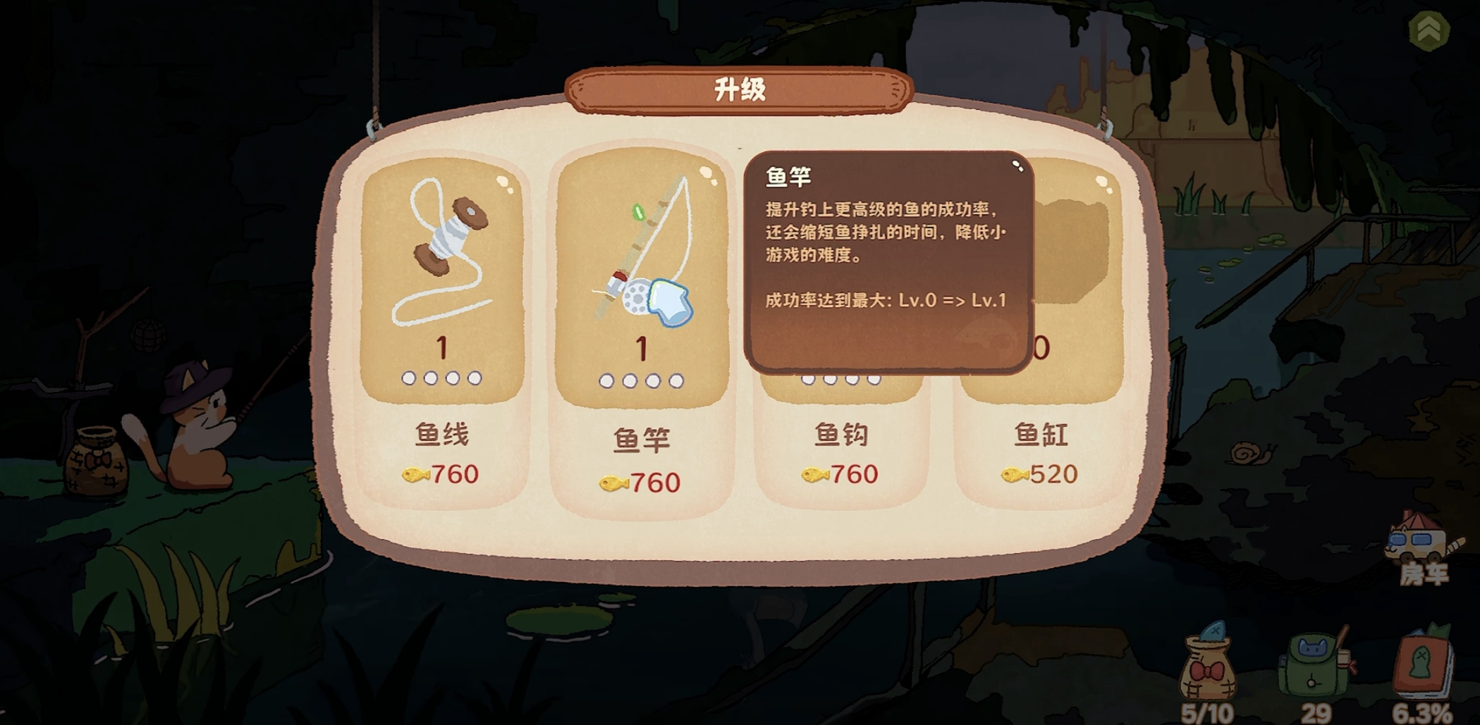 操作逻辑极简,新手三秒上手:小橘猫会自主端坐垂钓,玩家仅需关注两项关键资源——鱼饵补给与鱼篓清空。捕获的鱼类既可即时出售换取金币,用于强化钓具、提升成功率;也可移入鱼缸进行长期饲养,按时间周期自动产出稳定金币。高等级鱼种(如西游系列)不仅稀有度高,单体售价也显著优于普通鱼种,是后期经济积累的重要来源。
