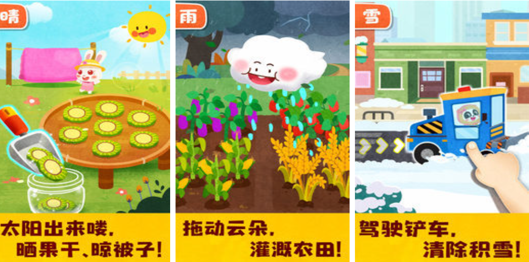 以四季轮转为时间轴,系统化呈现晴、雨、雪、雾、雷电等12类常见天气现象。每种天气均配备动态环境变化(如云层流动、雨滴轨迹、积雪增厚)、对应服饰搭配任务及户外行为判断小游戏,帮助儿童建立自然现象与生活经验的关联。界面采用大区块点击区域与延迟判定机制,降低误触率。