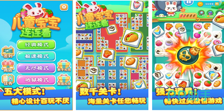 专为低龄儿童优化的图形匹配类益智游戏,消除对象全部采用食物主题(水果、甜点、饮品),图标尺寸放大至常规连连看的1.8倍,匹配路径自动高亮提示。内置闯关、限时、收集、挑战、无尽五大模式,道具系统仅含“提示”“重排”两类,杜绝复杂操作,专注训练观察力与短时记忆能力。