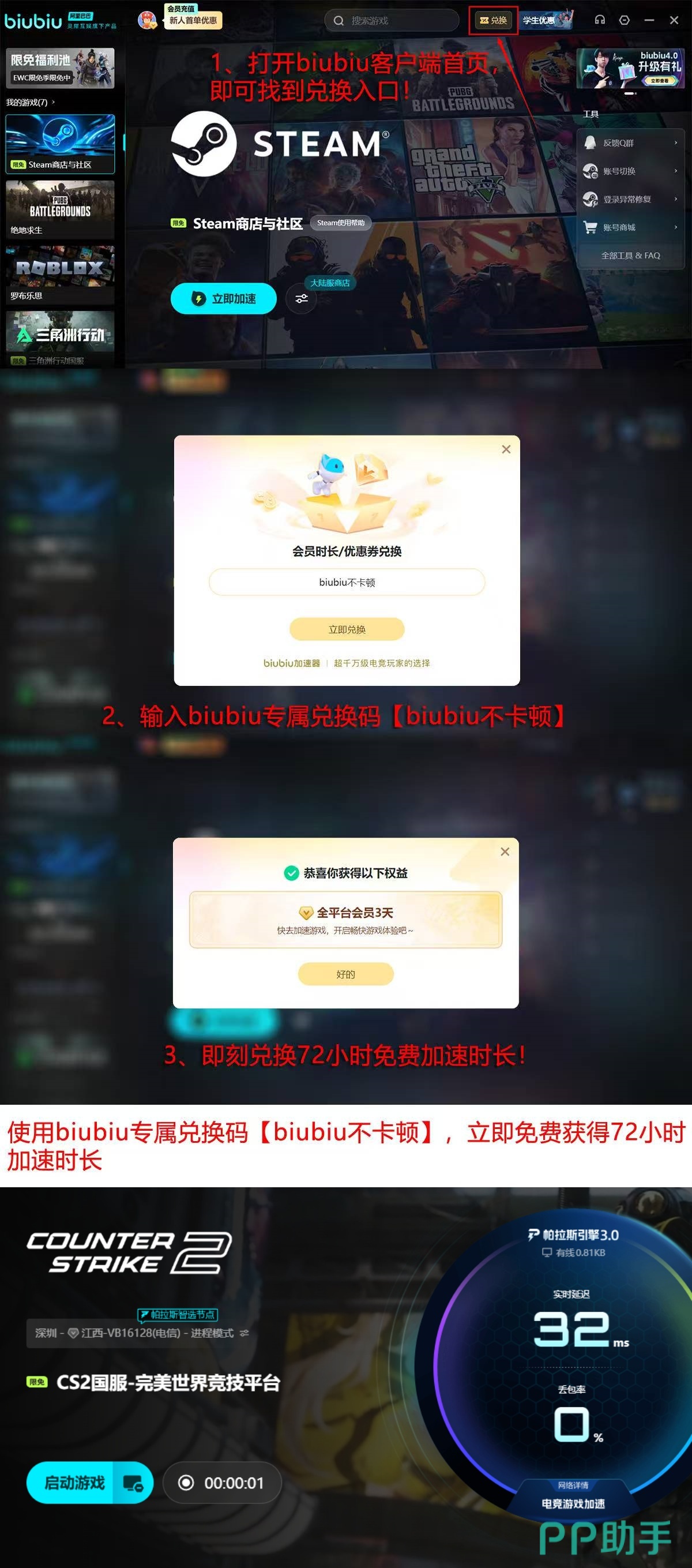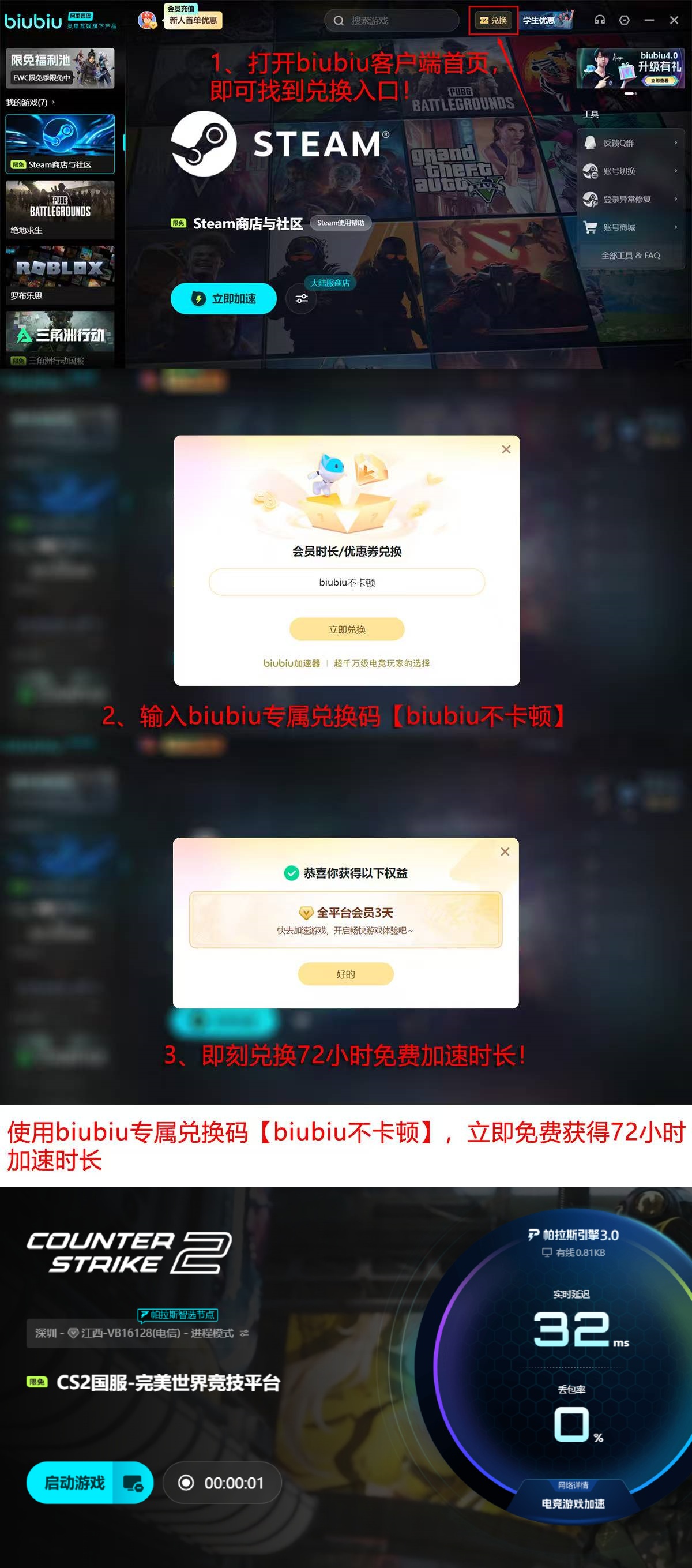 新用户完成注册后,系统自动赠送24小时全游戏加速时长;另可通过活动入口“biubiu不卡顿”领取3天基础会员权益,累计可享4天无限制加速服务,覆盖CS2及其他主流竞技游戏的深度体验周期。