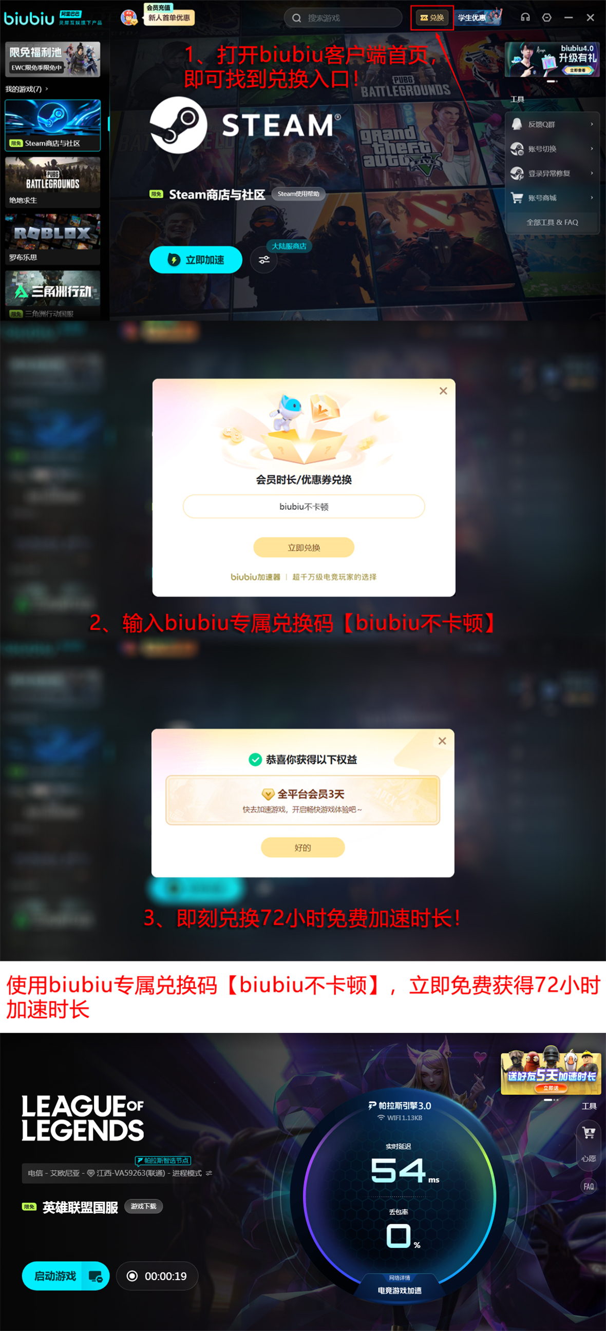目前biubiu加速器面向新用户提供双通道免费体验机制:注册全新账号即可获赠24小时全服加速权限;另可通过输入兑换码【biubiu不卡顿】额外领取72小时加速时长。两项权益叠加,新用户总计可享96小时无限制加速服务,充分覆盖多场景测试需求。