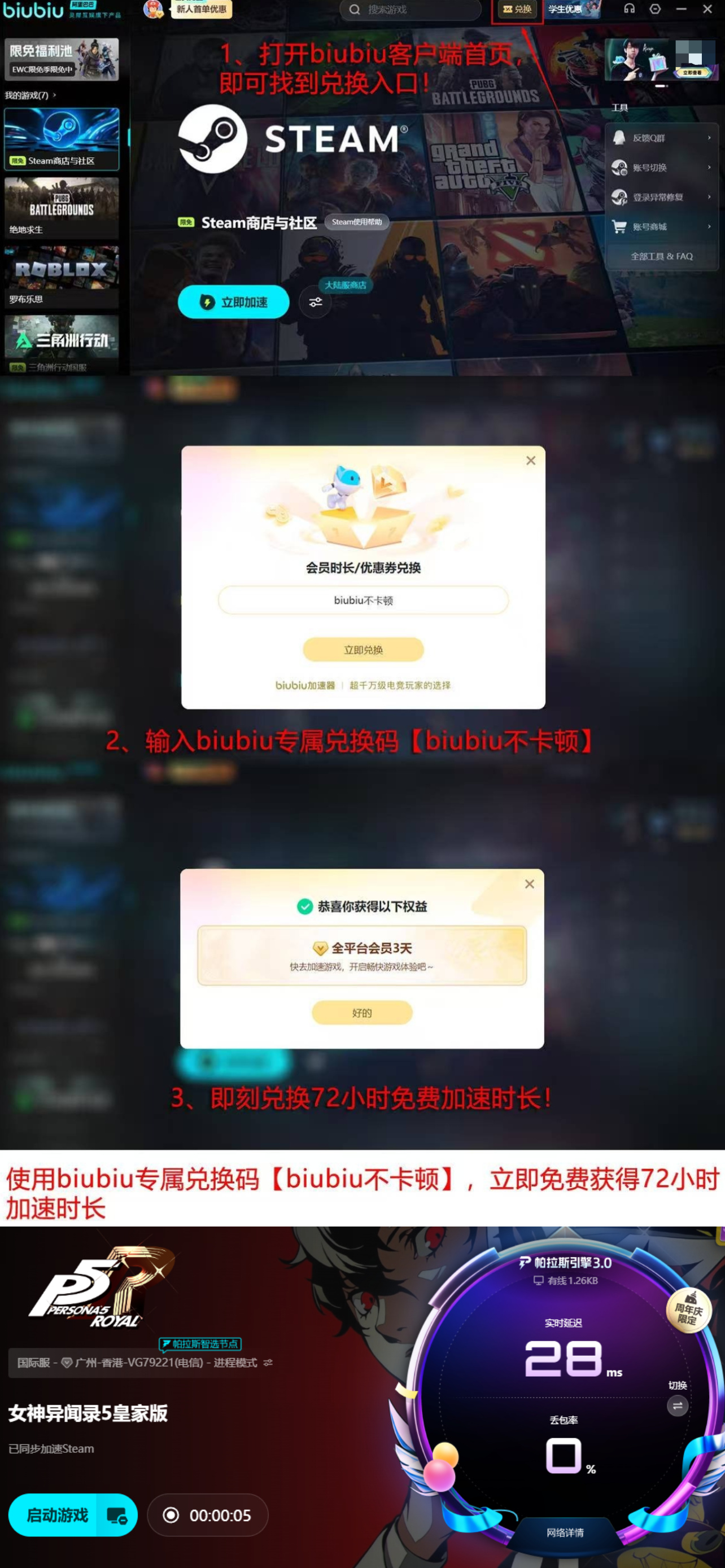 目前新注册用户可免费领取24小时全游戏加速权限;所有用户输入兑换码【biubiu不卡顿】,即可额外获得72小时通用加速时长。双重权益叠加后,体验周期可达96小时,足以覆盖完整主线流程及多人协作内容。