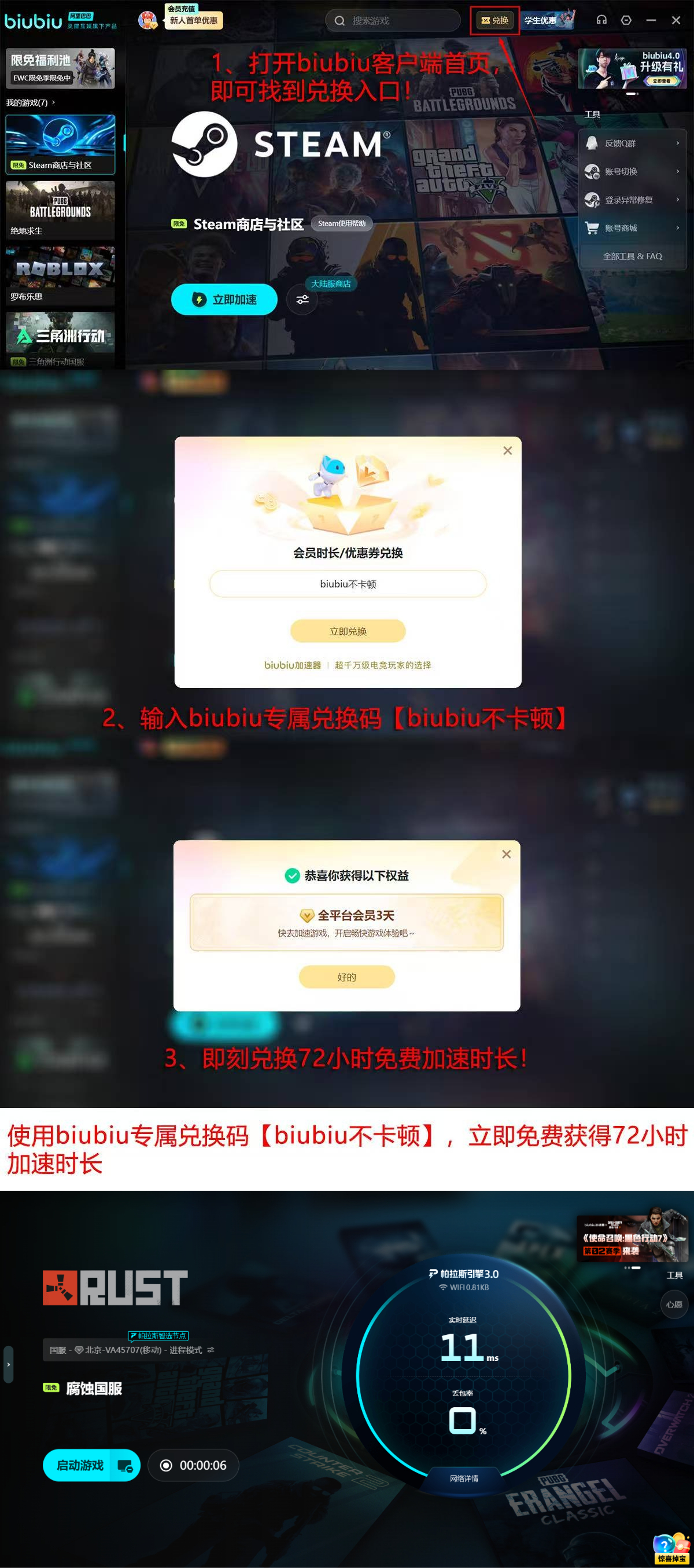 新用户注册即享首日24小时全功能免费试用权益,登录后输入激活码【biubiu不卡顿】,额外获赠72小时加速时长,叠加首日福利,总计可连续使用4天完整服务。