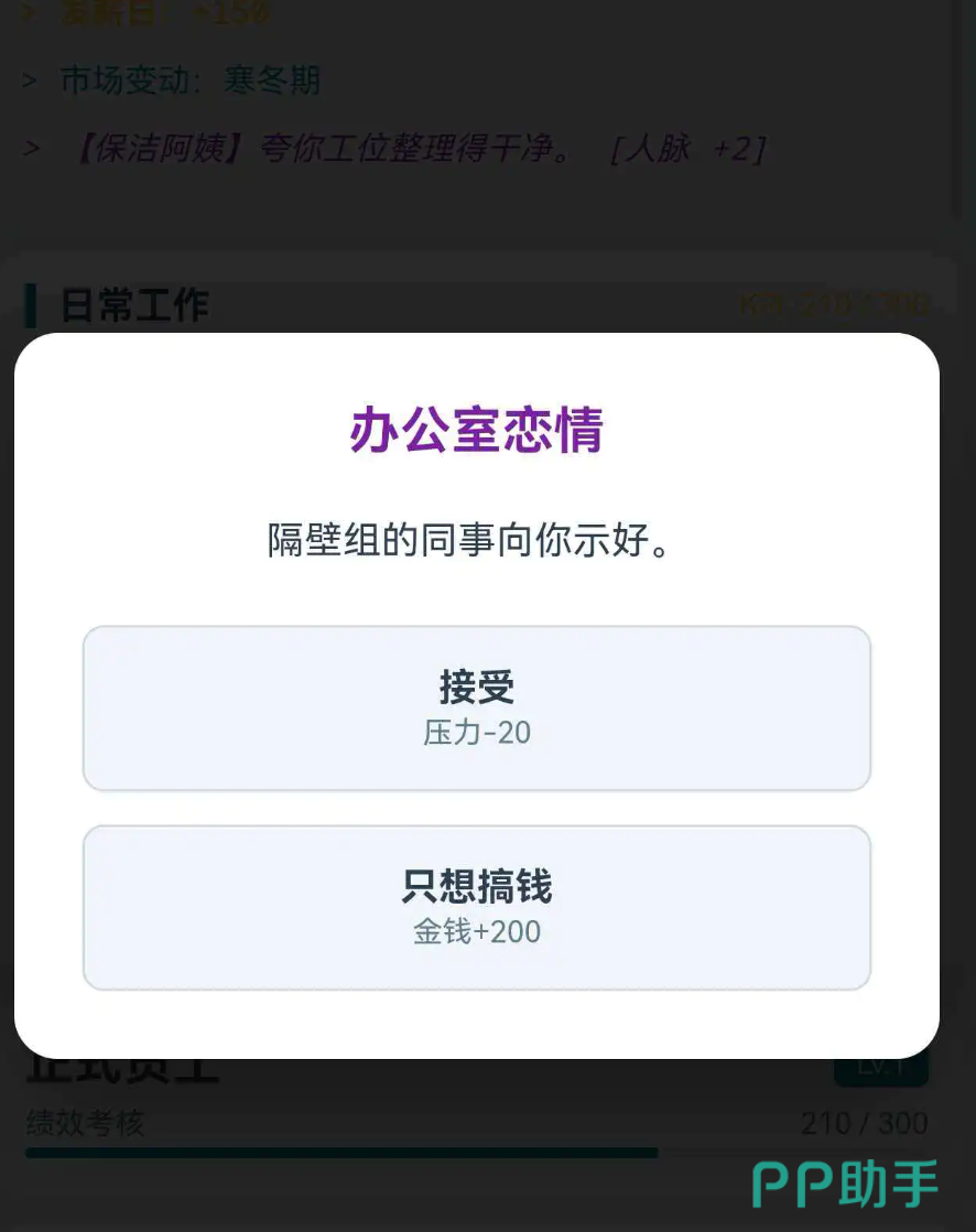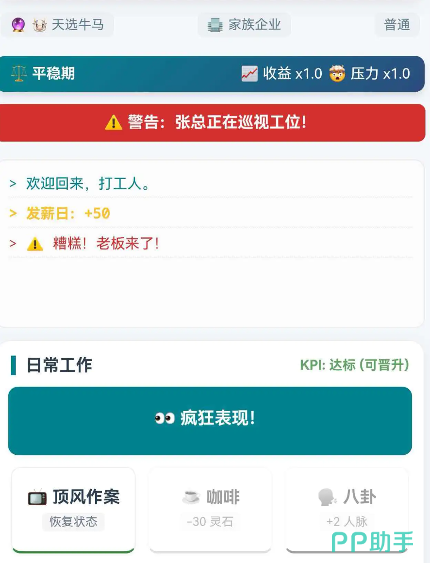 本作不仅延续了模拟经营类产品的策略深度,更通过“加班即炼气、OKR即心法、年终述职即雷劫”的创意设定,构建出极具代入感的双轨成长模型。其叙事张力与系统复杂度随版本持续升级,为偏好高沉浸、强反馈、具现实映射属性的玩家群体,提供了兼具解压效能与成长快感的独特体验路径。