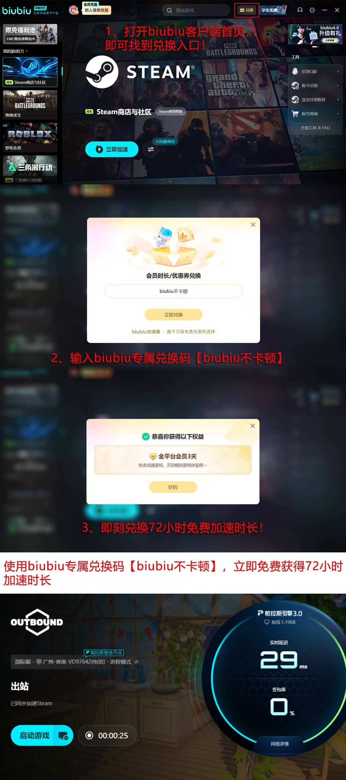 为降低新用户尝试门槛,biubiu当前提供面向首次注册用户的24小时免费加速权益。若需延长使用周期,可输入兑换码【biubiu不卡顿】,成功核验后即可额外获得72小时连续加速权限。