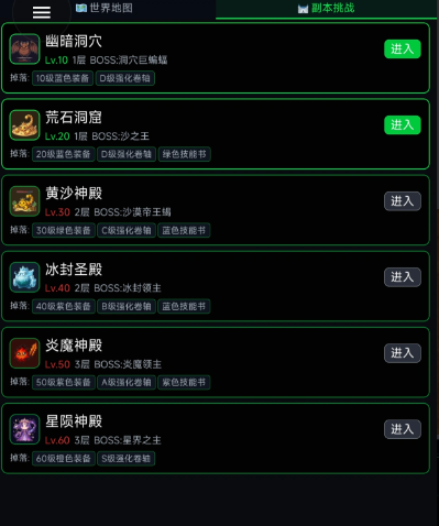 游戏构建了层次分明的世界观场景,涵盖幽暗洞穴、荒石洞窟、黄沙神殿、冰封圣殿四大主题副本区域。每个区域具备独立怪物生态与BOSS机制,通关后可稳定获取强化卷轴、蓝色品质装备等核心资源,支撑角色长期战力演进路径。