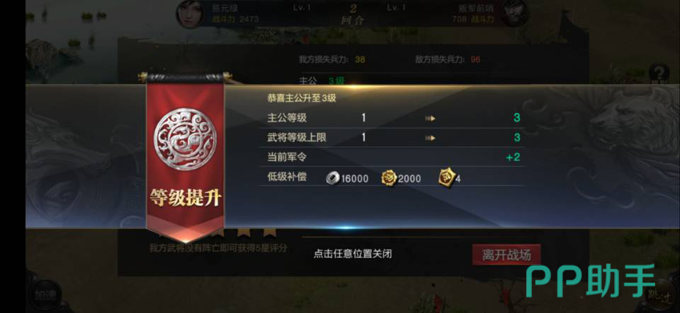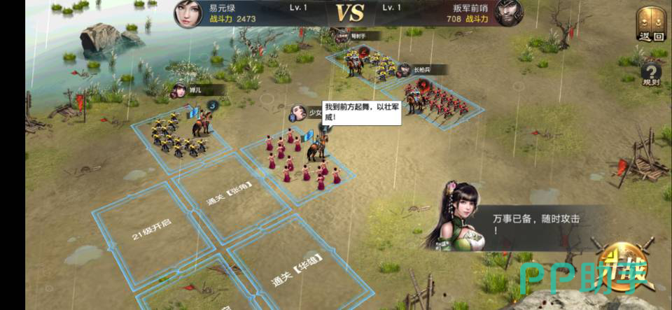 4.算起来接下来才是真正的两军对抗,这时候我们就需要派兵布阵运用军法取得该场游戏的胜利,上场我们新获得的武将,点击右下方的开战。