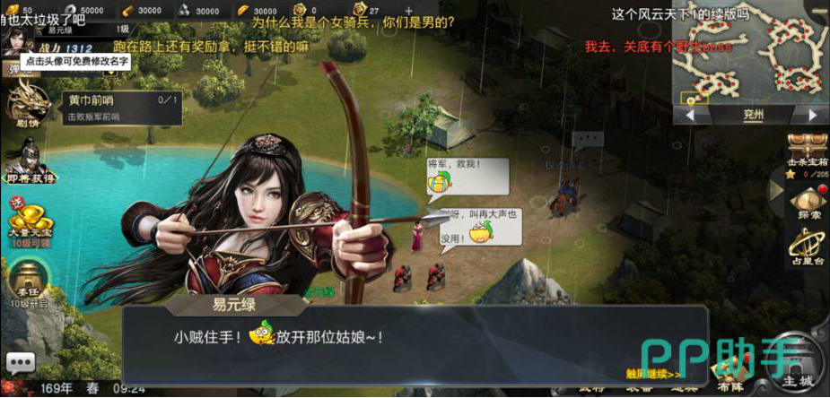 1.在汉末的九州地界,我们要先在董卓烦乱的中心开启属于自己的篇章,先是发现了被小毛贼围困的少女蝉儿,当然要出售相救教训一下他们,人物移动过去就可以轻松解决。