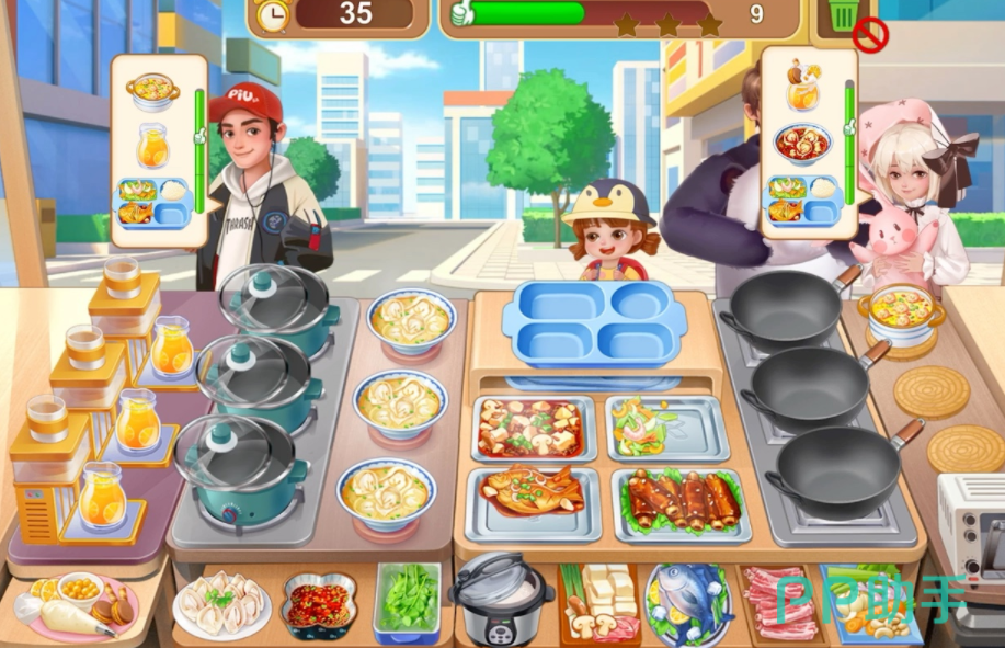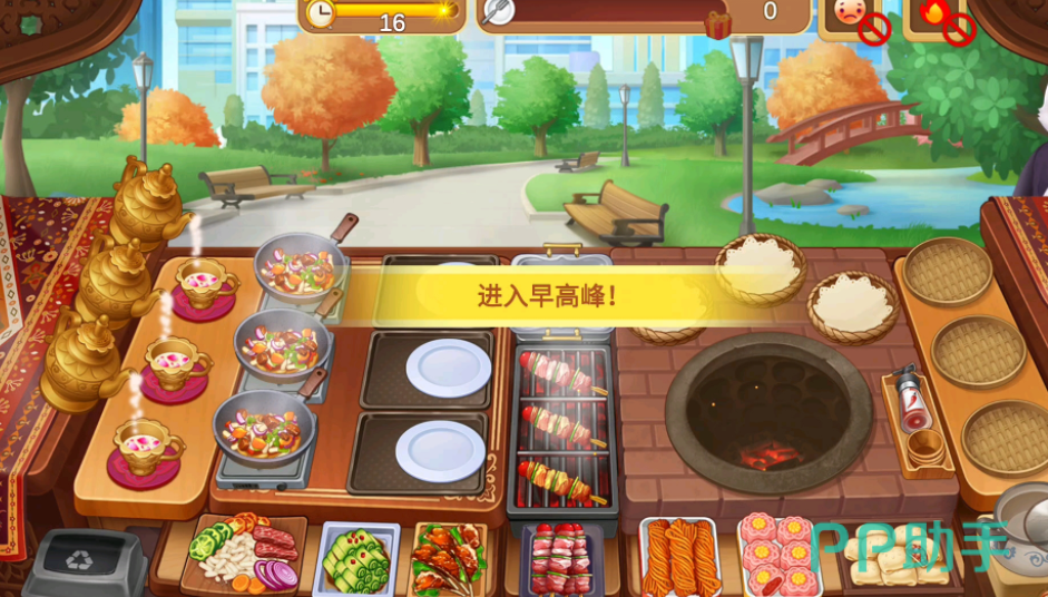 首先小伙伴们可以在“进入早高峰”这几个字出现之后,就立刻点击屏幕上的食物,将可以烹饪的东西先烹饪起来,这样当客人来的时候就不至于手忙脚乱。当然仔细的观察也是十分必要的,因为每一位客人提出的要求都可能会有一些细微的不同,因此小伙伴们也不要先急着做出成品,以免没有客人需要,导致了浪费时间。