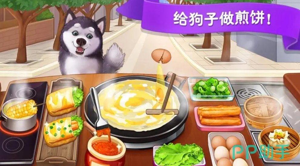 因为这是一个烹饪类型的模拟经营游戏,所以在游戏中肯定会涉及到菜品的制作,刚开始进入游戏,玩家面临的是烹饪最简单的煎饼制作,玩家所需要操作的步骤比较少,是相对来说最简单的一种食物烹饪,玩家只需要按照游戏中的提示摊开面糊,然后打上鸡蛋,再根据客人的需求放上相应的食材就可以,制作完毕之后直接把食物滑动到客人手中就可以。