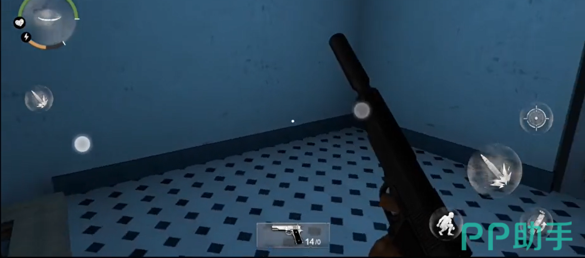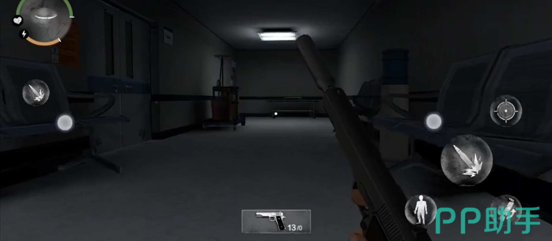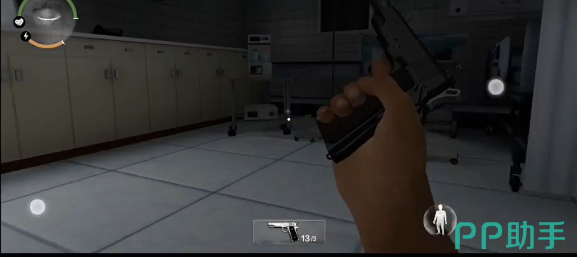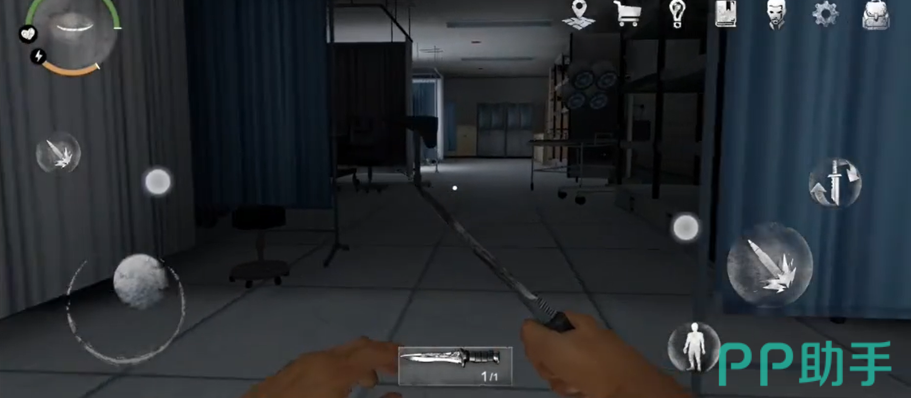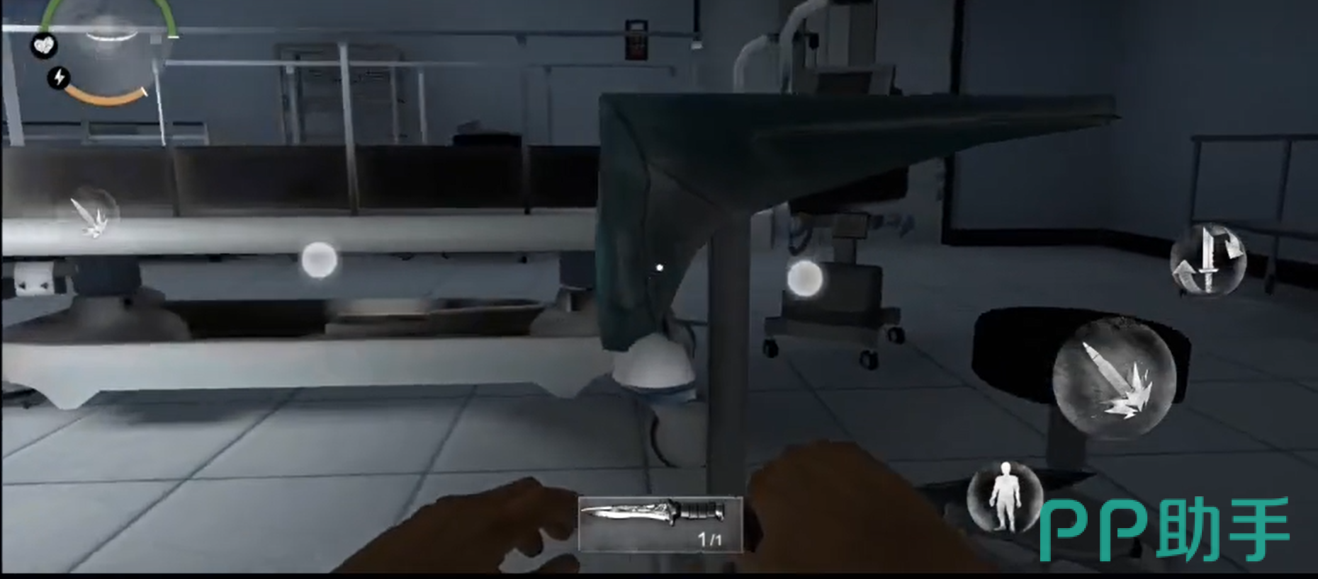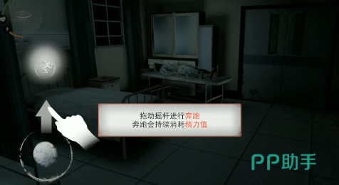 玩家打开门会发现自己在一个病房,而且病房上有一句尸体,尸体上面有一把刀,玩家可以将刀子吧出来当做自己的防身武器。同时玩阿基在游戏中还可以进行奔跑,但是奔跑会消耗玩家的精力值,所以玩家需要合理的进行分配。