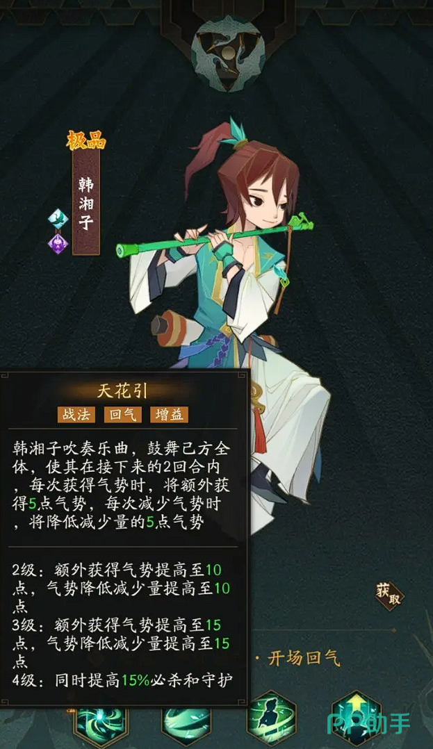 如果选择人族妖族辅助的话,人族中的杜康可以作为群体增伤辅助,而仙族的韩湘子则是控制战场气势的关键,能够为我方全体回复气势,并降低敌方气势。太子长琴则提供群体治疗和驱散效果,是前排坚固的治疗型辅助。