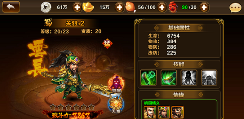 三国过去中,每位将领全都有与别人物的出色情节,当一些一定的将领与此同时出场后,还能够引发将领的潜伏力量,大大提高将领的战斗力,每名将领都得到好几个情缘技能。