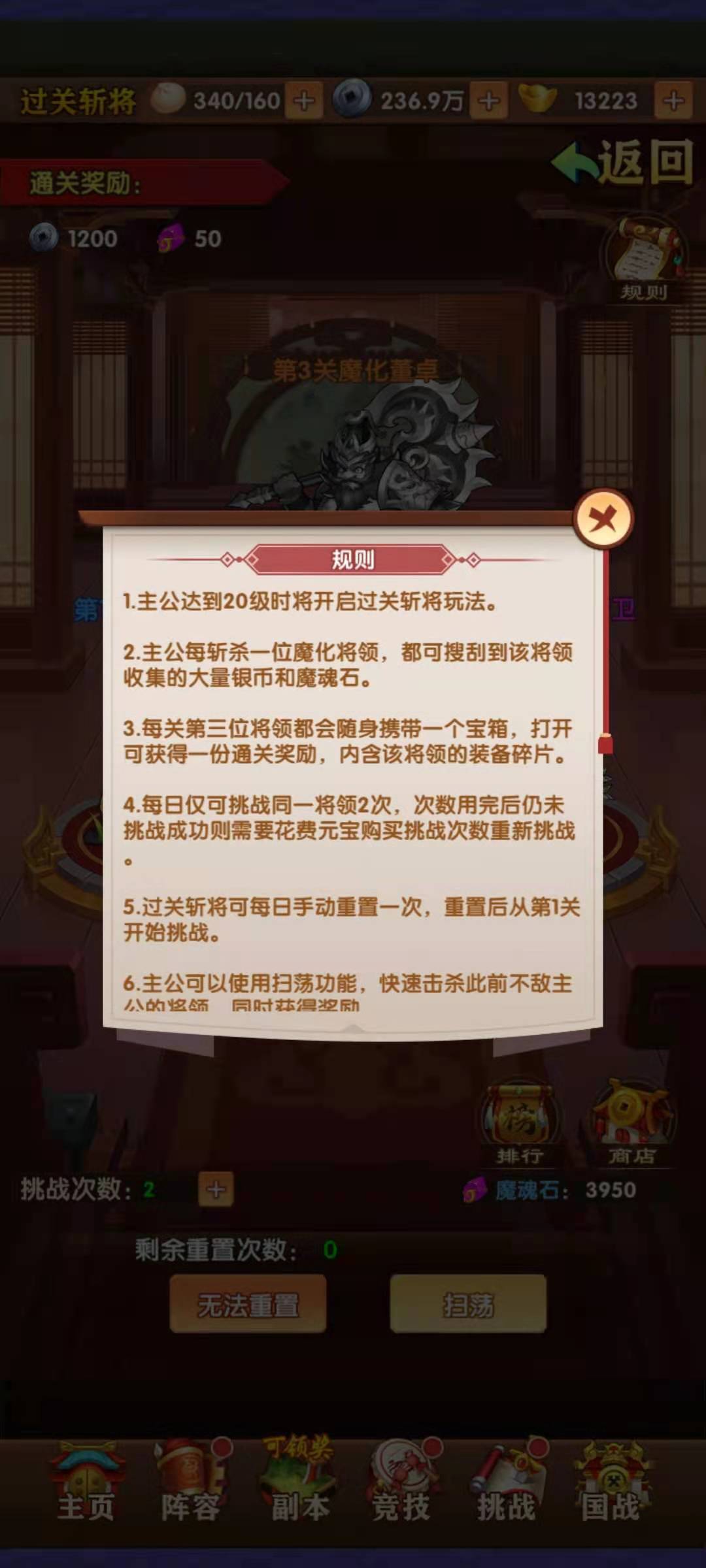 百战活动每天都可以进行挑战,活动是由一个个关卡组成的,每个关卡有三名守将,其中前两名都是小兵,最后一名是魔化的英雄武将来镇守,玩家每击杀一名魔化的武将,军哪个得到银币和魔魂石的奖励,当把当前关卡守将都击败之后,就能获得本关的宝箱奖励了。