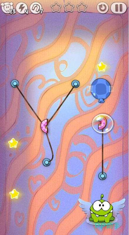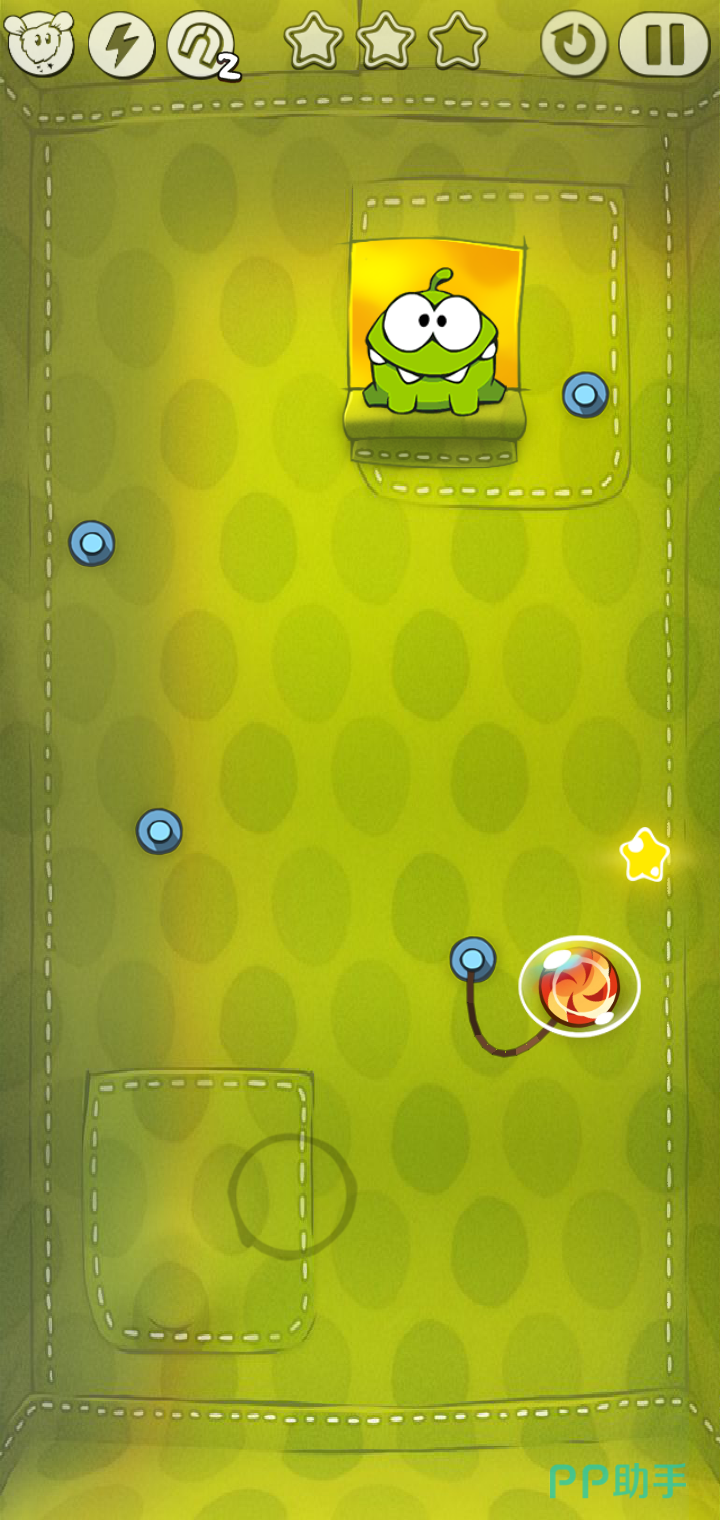 然后糖果会吃到的三个星星,然后糖果会在空中晃动,我们抓准时机把糖果的绳子的绳子割掉,糖果会荡到奥姆嘴边,奥姆就吃到了啦!