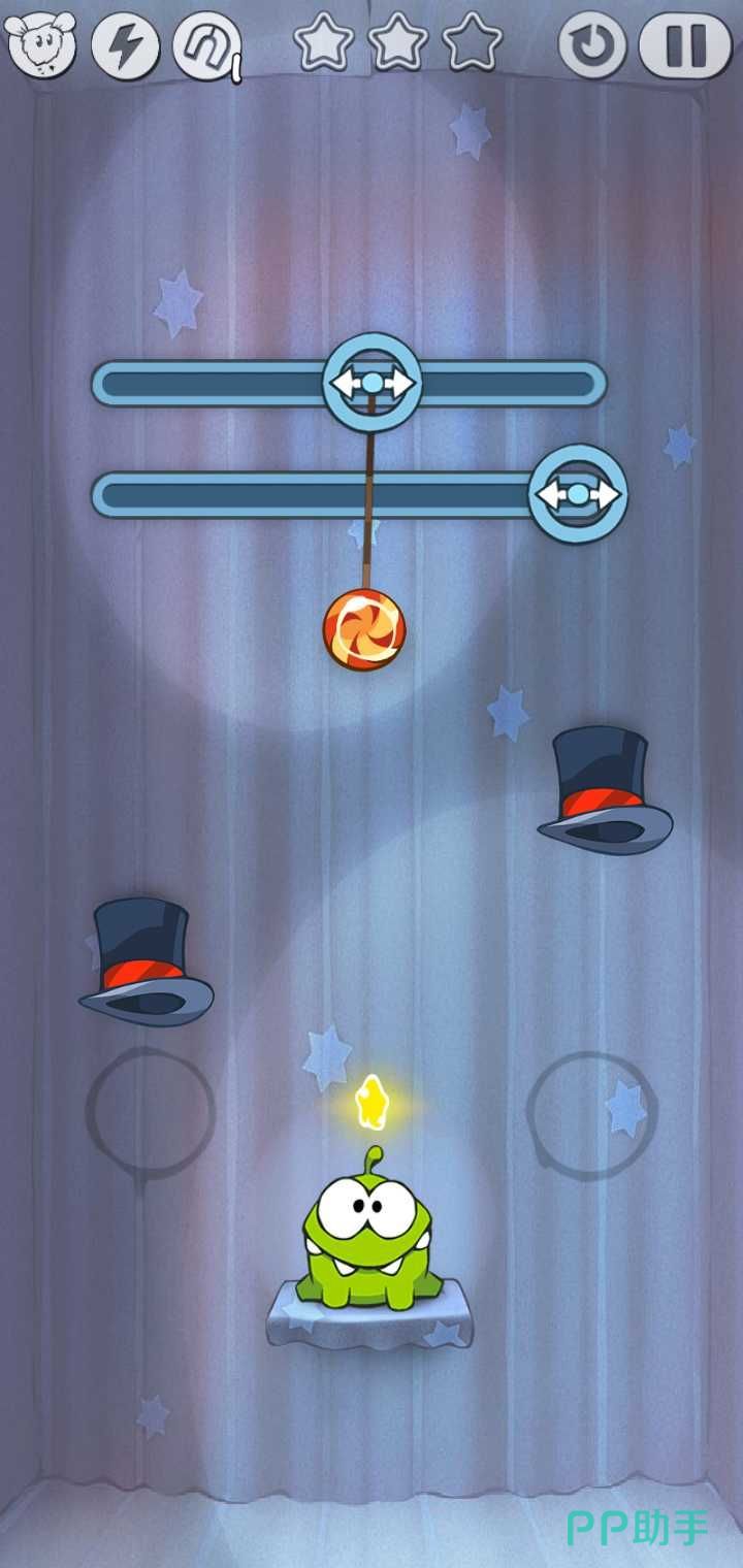 如果是不太会掌控角度的小伙伴建议移动的时候不要让糖果摇晃幅度太大。有两个魔术帽在移动,我们需要在一个魔术帽移动离开一个魔术帽快要临近从左到右数第一颗星星的时候,割掉绳子。