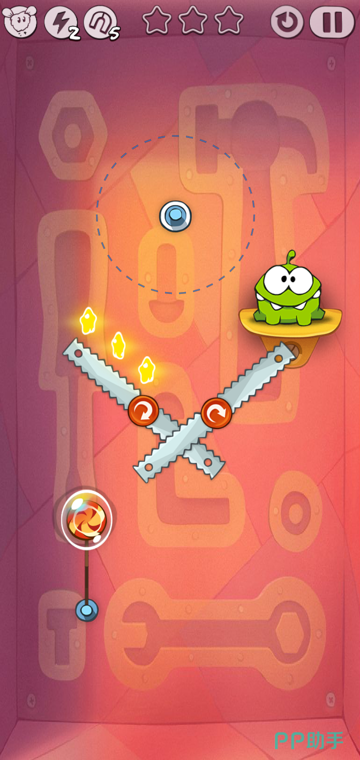 最后我们等旋转锯子摆成一个“1”字时,我们要迅速地割掉绳子,将泡泡戳破,这样糖果就被奥姆吃掉了