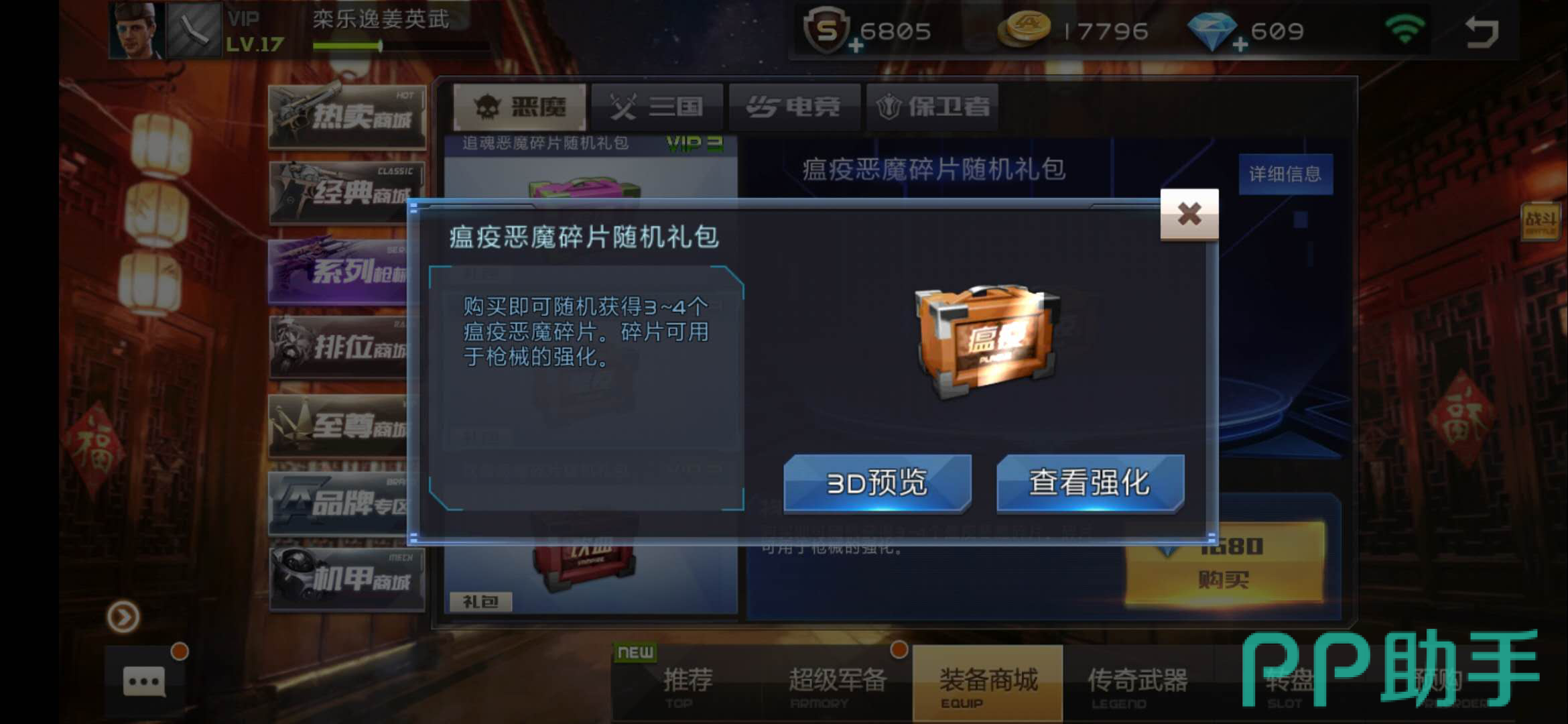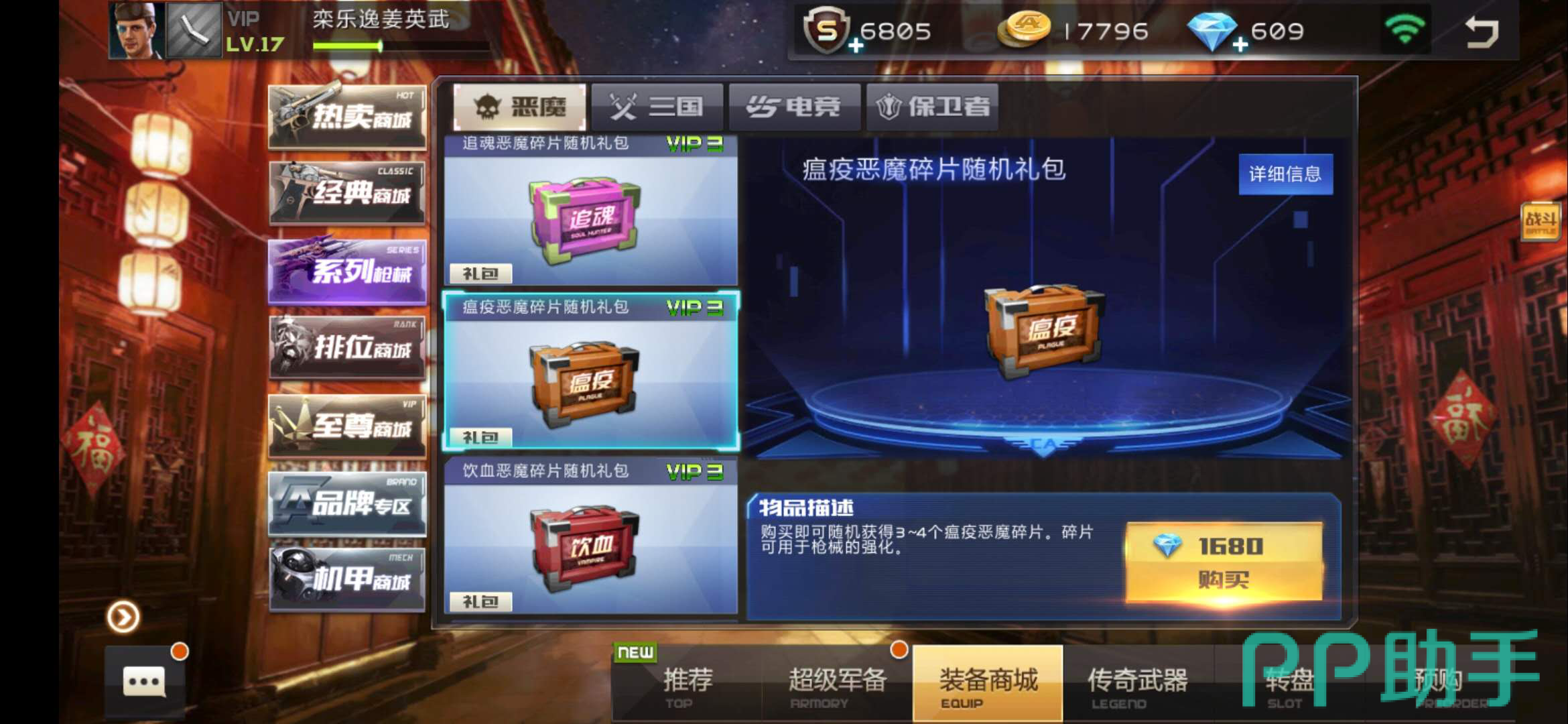 在商城中的系列枪械中,选择恶魔系列,在恶魔系列的菜单中可以找到瘟疫恶魔的随机礼包,花费1680点钻石可以购买一个随机礼包,其中可以随机开出瘟疫恶魔枪械的碎片,通过碎片可以合成出一把完整的瘟疫恶魔。