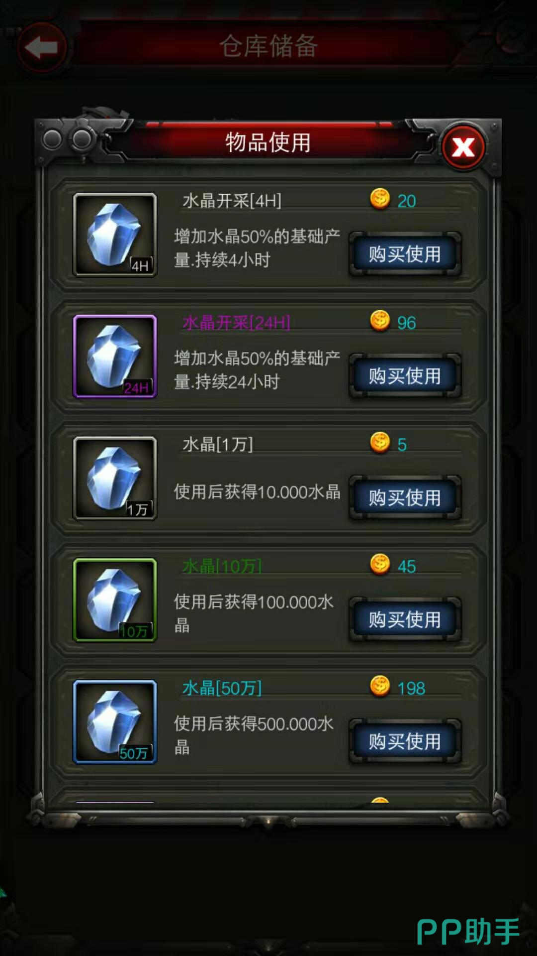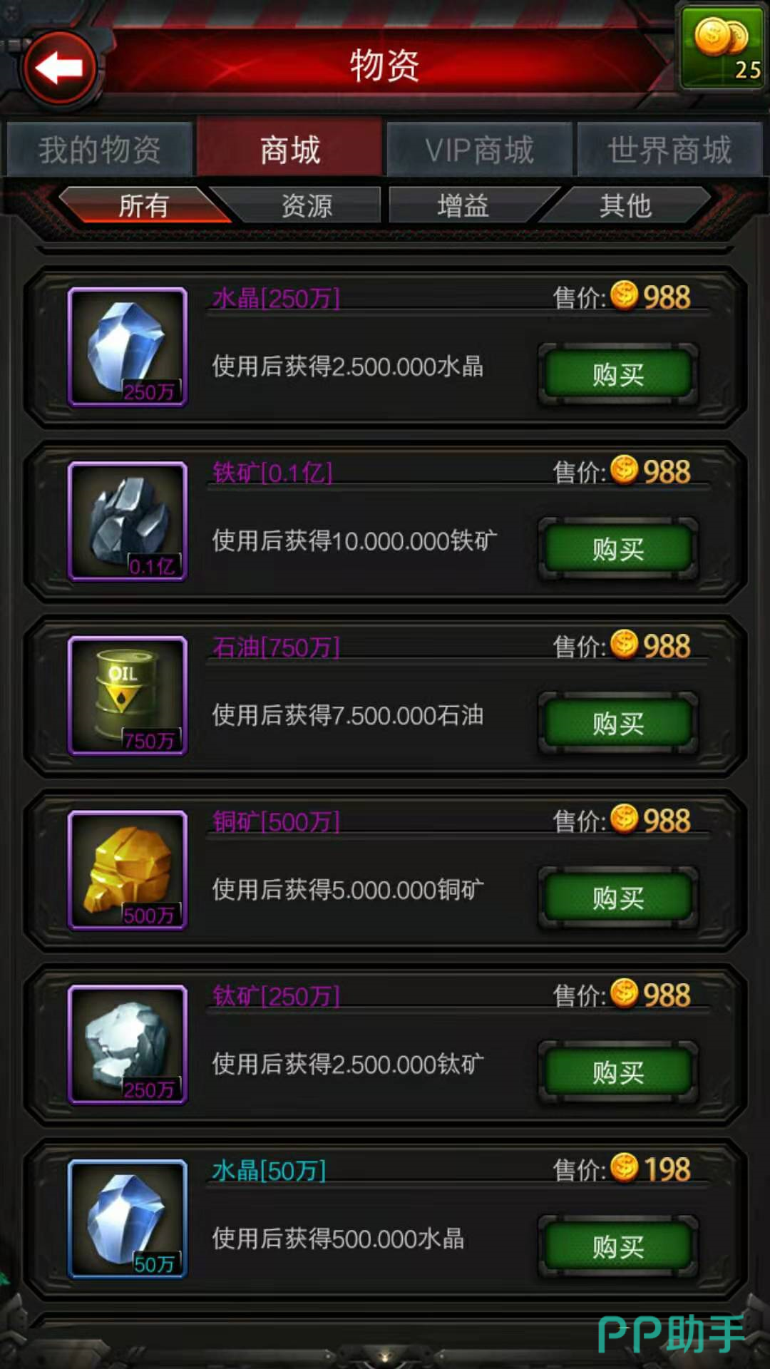 如果想要买进矿产资源的话,商城里同样可以购买到各种矿产物资。水晶,铁矿,石油,铜矿,钛矿应有尽有。250万水晶,0.1亿铁矿,750万石油,500万铜矿,250万钛矿的售价都是988金币。50万水晶,200万铁矿,150万石油,100万铜矿,50万钛矿的售价都是198枚金币,价格还是比较划算的。