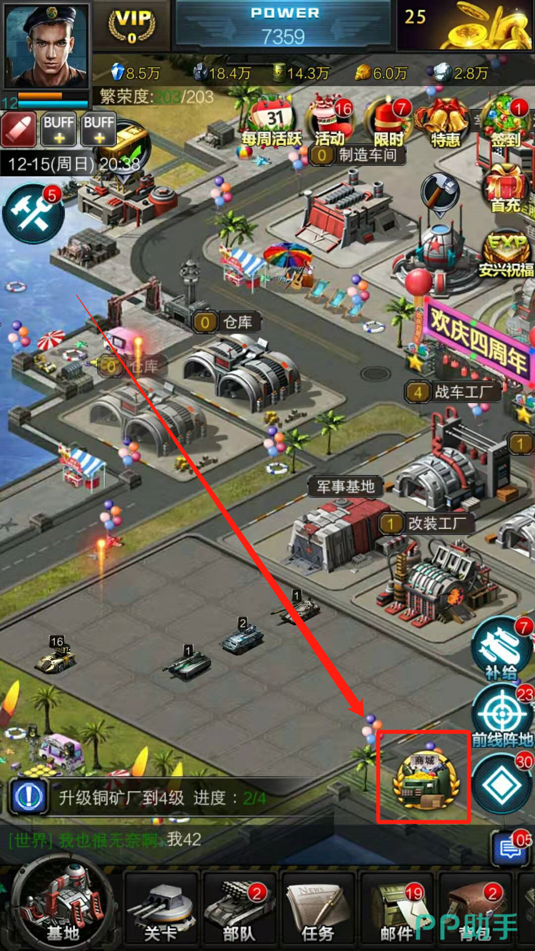 想要卖矿产等资源的话,需要先进入我方基地的主界面,在界面的右下方找到商城的按钮。点击进入商城,点击第四个栏目世界商城。在世界商城中,玩家可以自由的交易矿产等物资,设置好想要卖的物资的数量即可将矿产卖出。