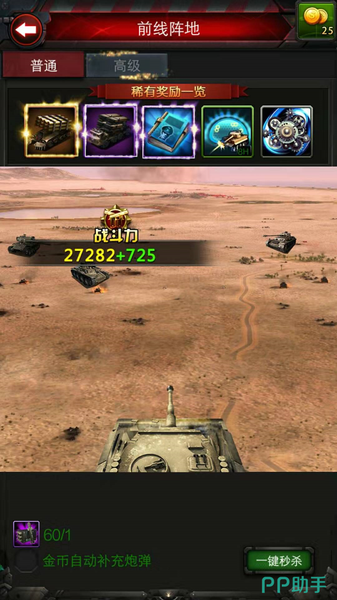 在游戏的主界面中点击前线阵地,花费炮弹攻击屏幕上的坦克,有几率获得配件奖励。其中高级阵地获得高级配件的概率更高一点,高级阵地需要花费3枚炮弹。