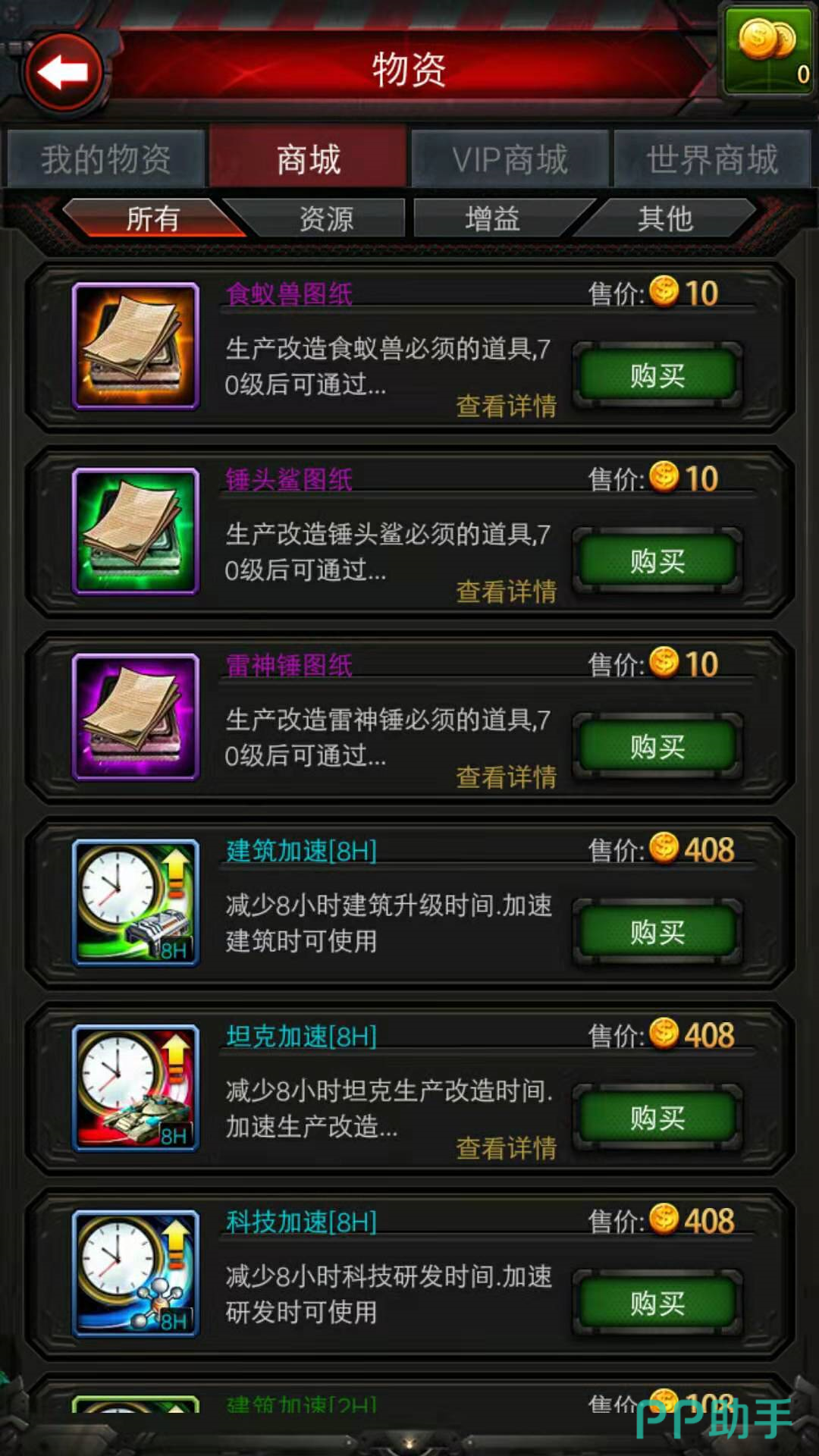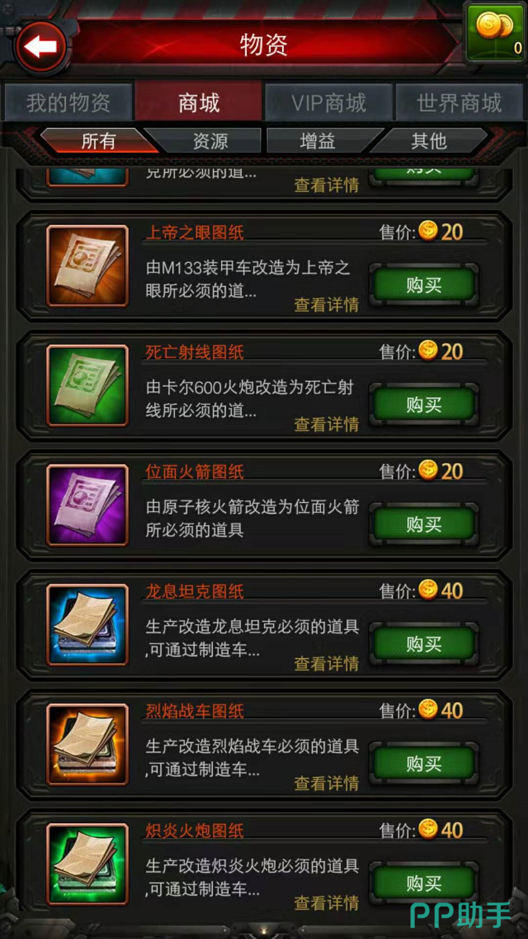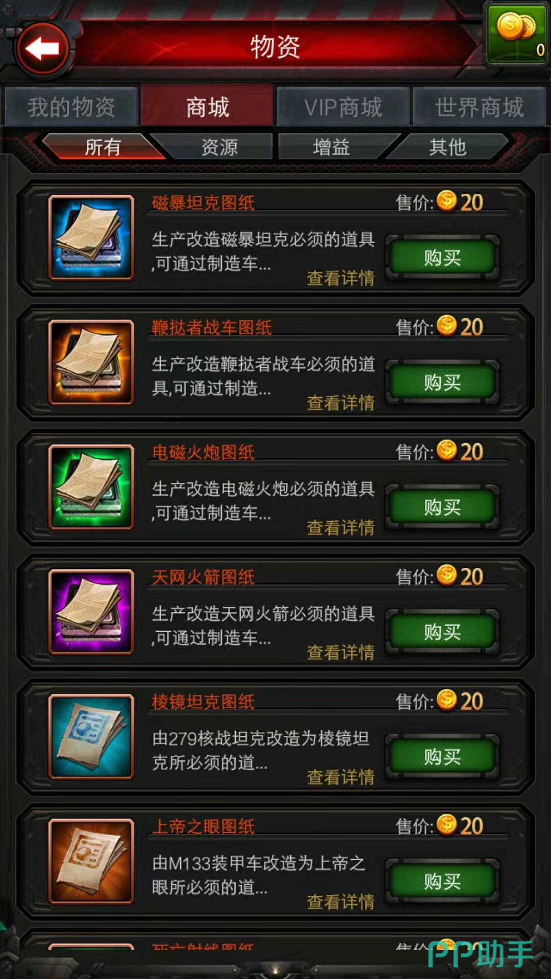 进入游戏的商城界面,一直往下拉,可以看到有四份图纸,是我们在战车工厂中可以使用的。分别是猛犸图纸,食蚁兽图纸,锤头鲨图纸和雷神锤图纸,猛犸图纸是改造猛犸坦克所必须使用的道具,70级以后可以在关卡里面获得。在商城里可以花费10枚金币直接购买。