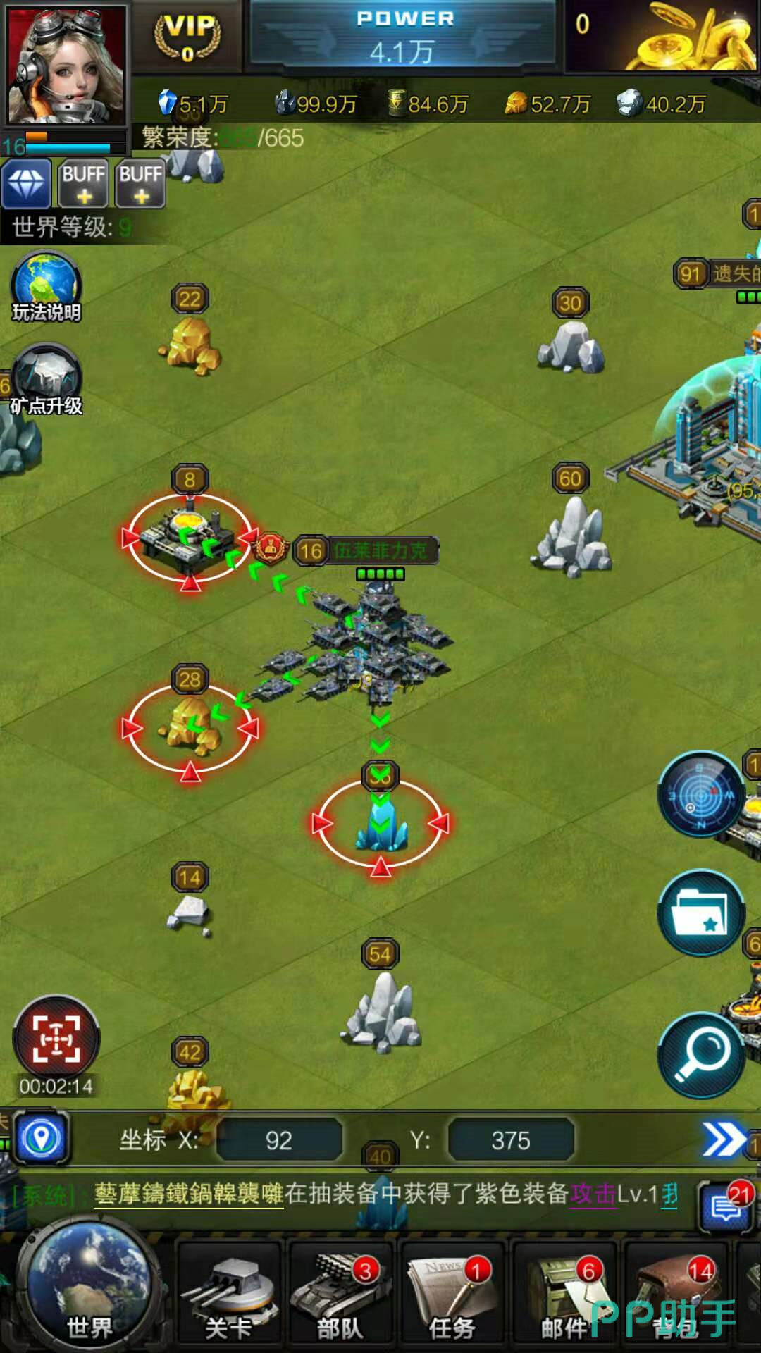 点击左下角的圆形按钮进入世界界面,世界矿产的分布都是随机的,黄色矿石是铜矿,白色矿石是钛矿,蓝色矿石是水晶,油矿是一座特殊的产油器,每座矿产上方的数字是这个矿产的等级,等级越高的矿产兵力守备越森严,需要派遣更多的部队前往采集。
